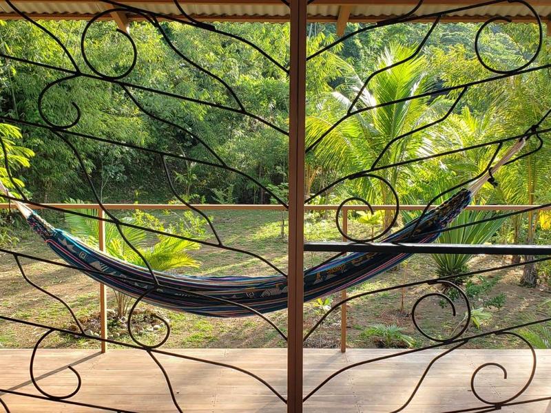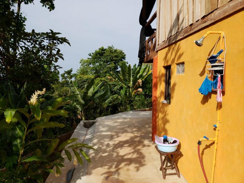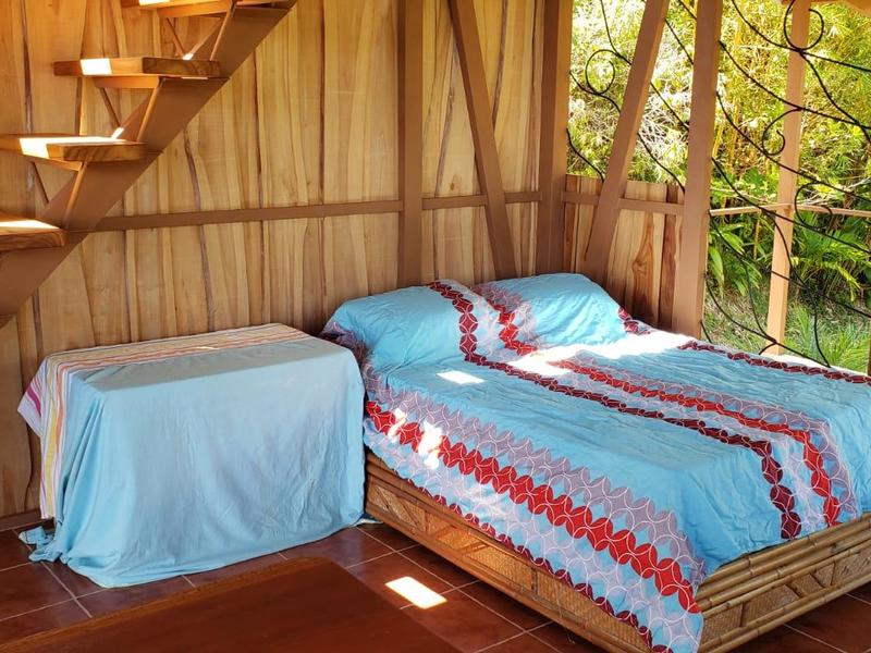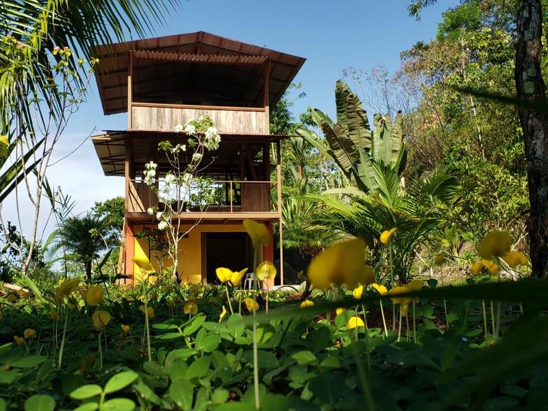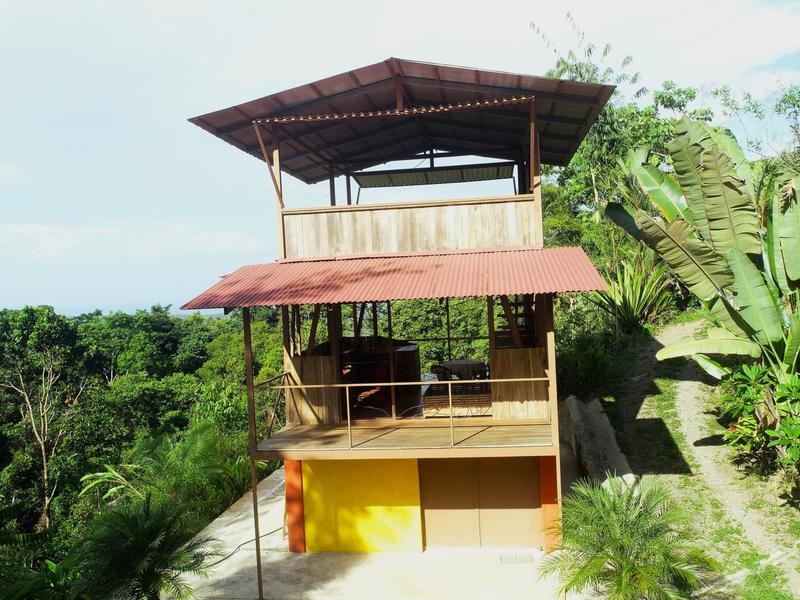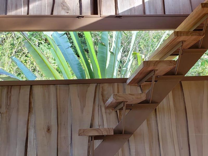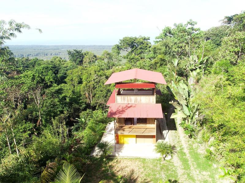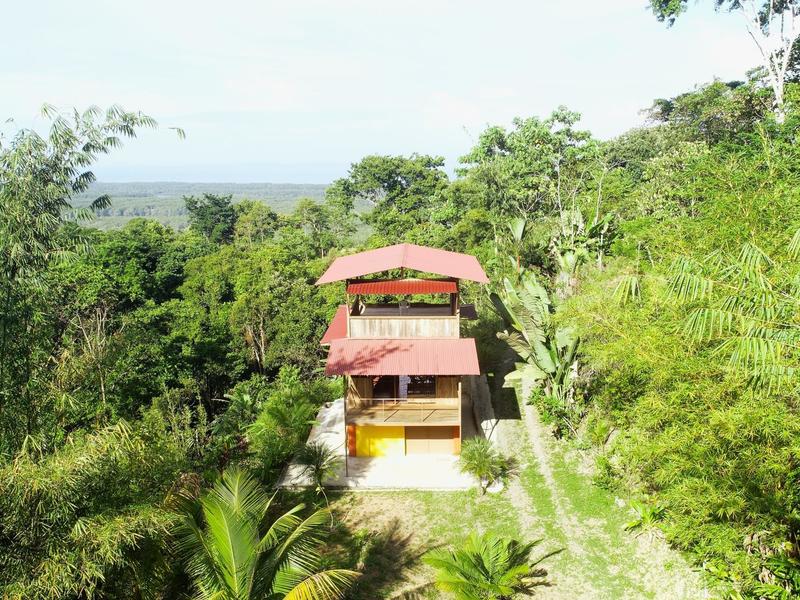 While having a small footprint, the house rises to 3 levels in height. The bottom level is fully enclosed and dedicated to a cozy bedroom and bathroom with an outdoor shower. The second level contains a bed and kitchenette, while the top level offers total relaxation: an open area with a hammock and stunning views of the jungles and hills that terminate at the blue Pacific Ocean.