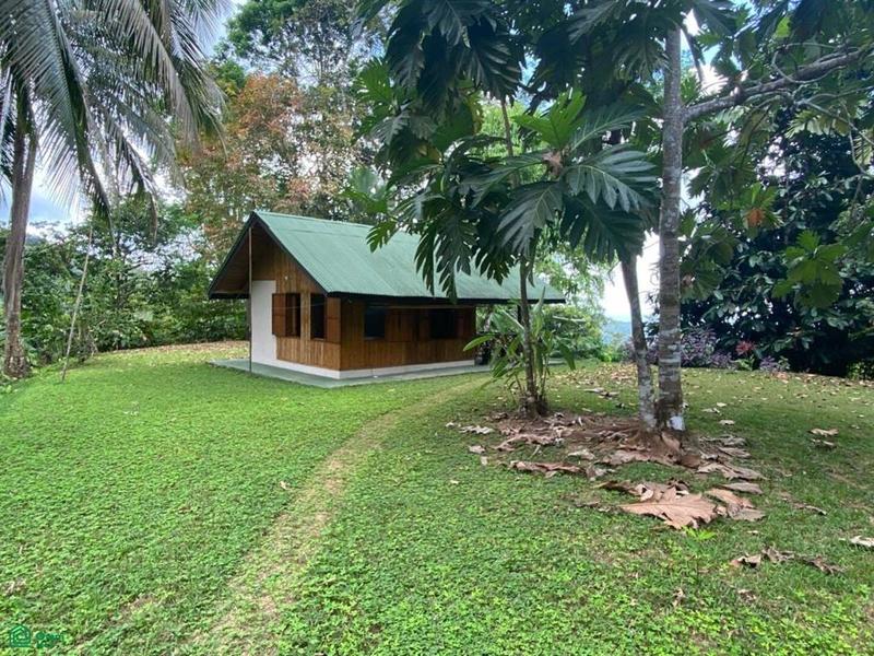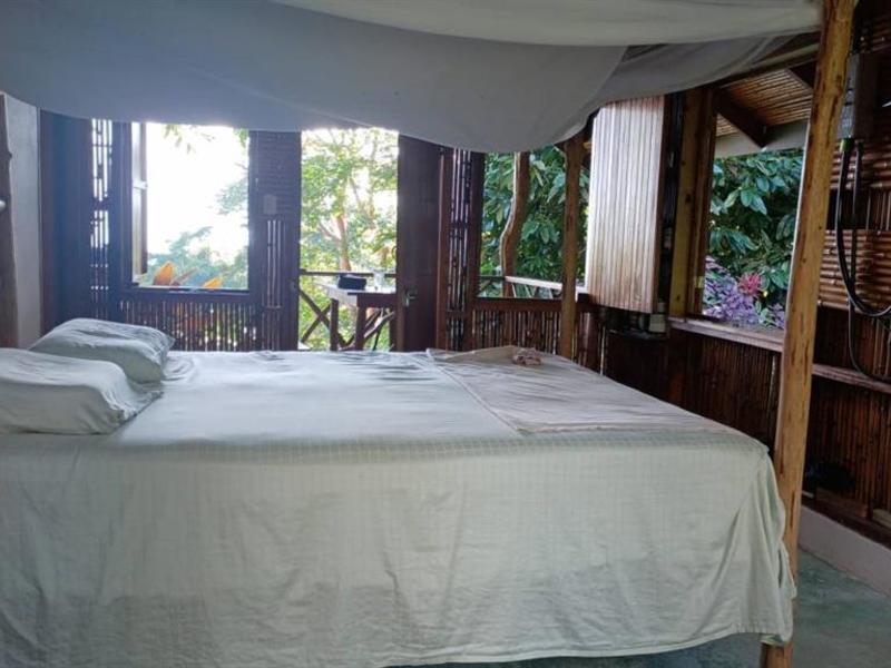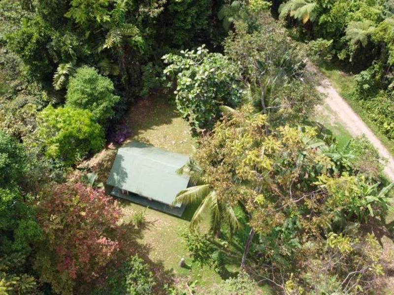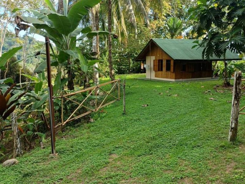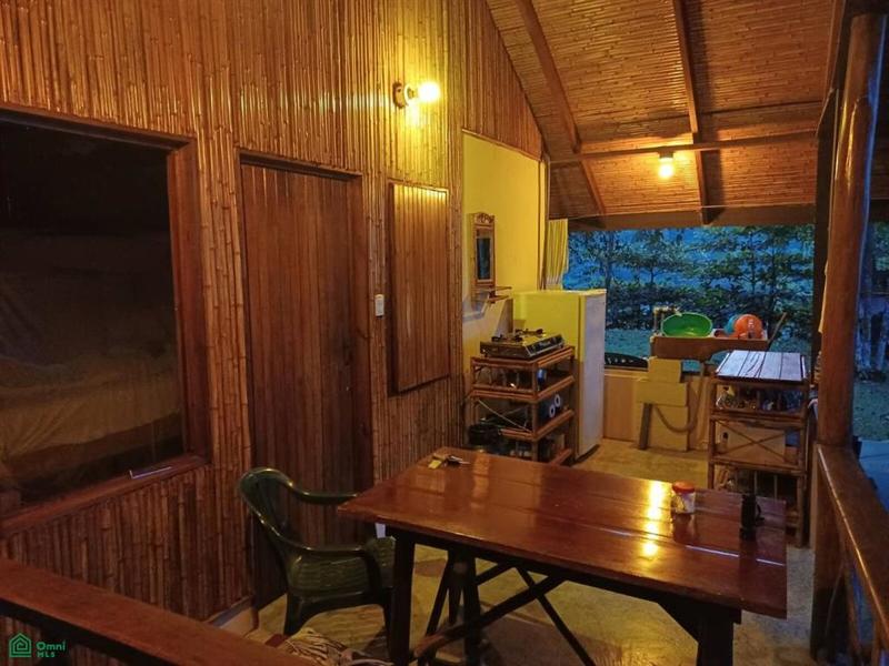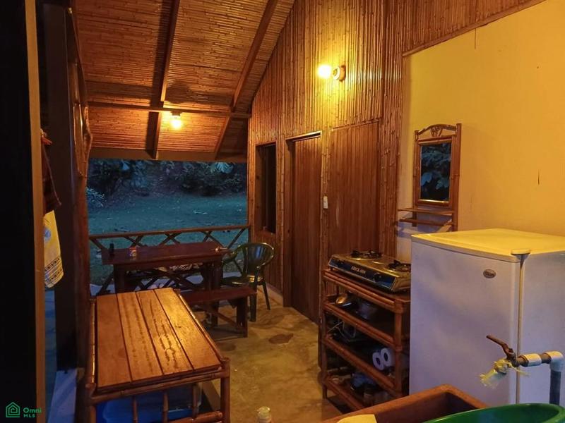 At the heart of this tropical haven is a rustic cabin crafted from wood and bamboo. The cabin boasts a cozy bedroom, a small kitchen, and a bathroom, complemented by a delightful patio where you can bask in the serenity of your surroundings. An additional small storage room adds practicality to this jungle retreat.