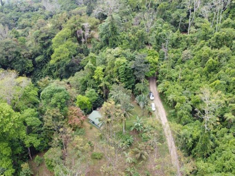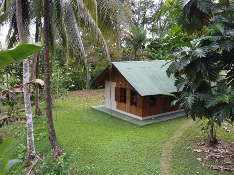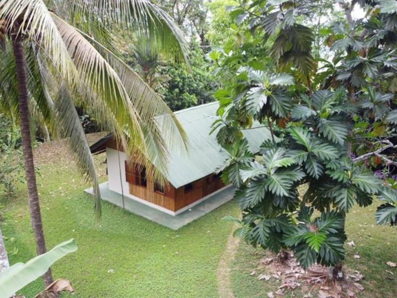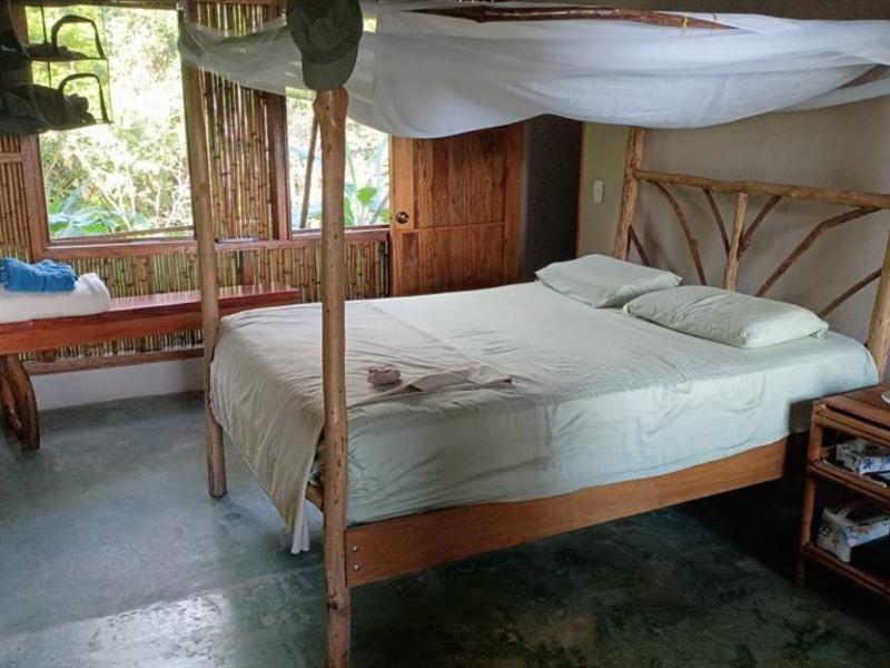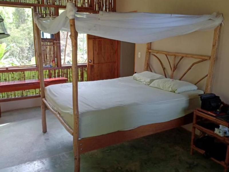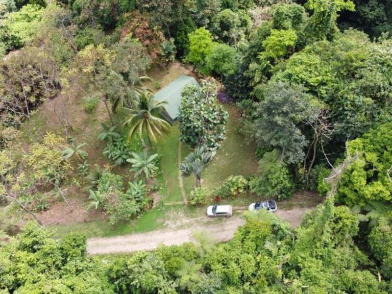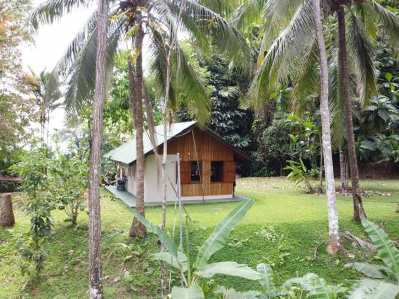 At the heart of this tropical haven is a rustic cabin crafted from wood and bamboo. The cabin boasts a cozy bedroom, a small kitchen, and a bathroom, complemented by a delightful patio where you can bask in the serenity of your surroundings. An additional small storage room adds practicality to this jungle retreat.