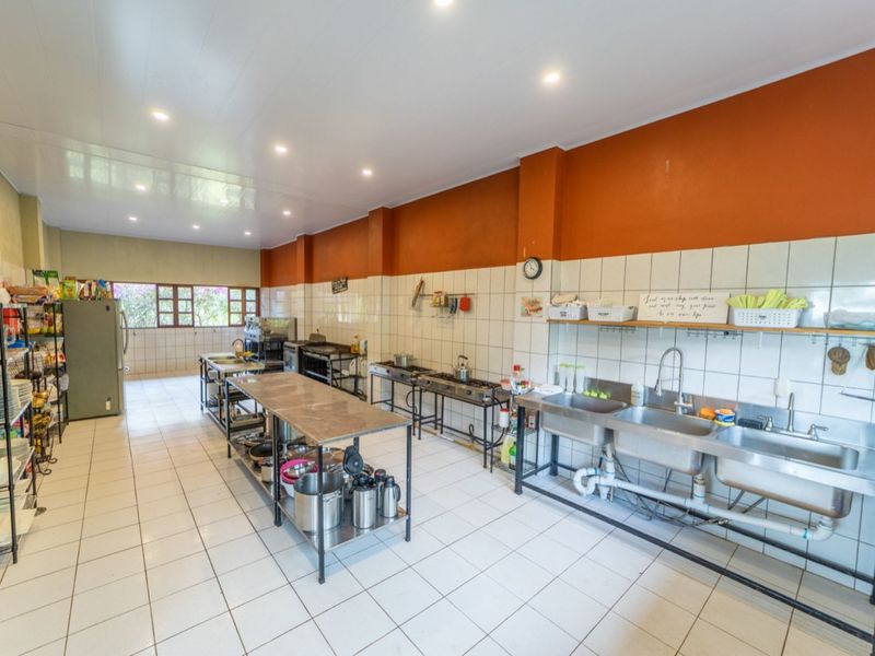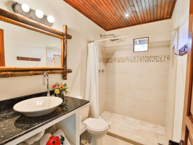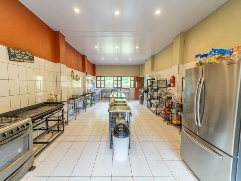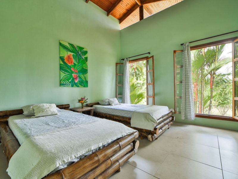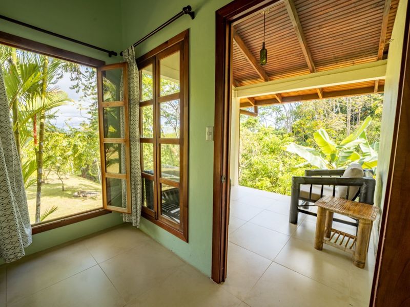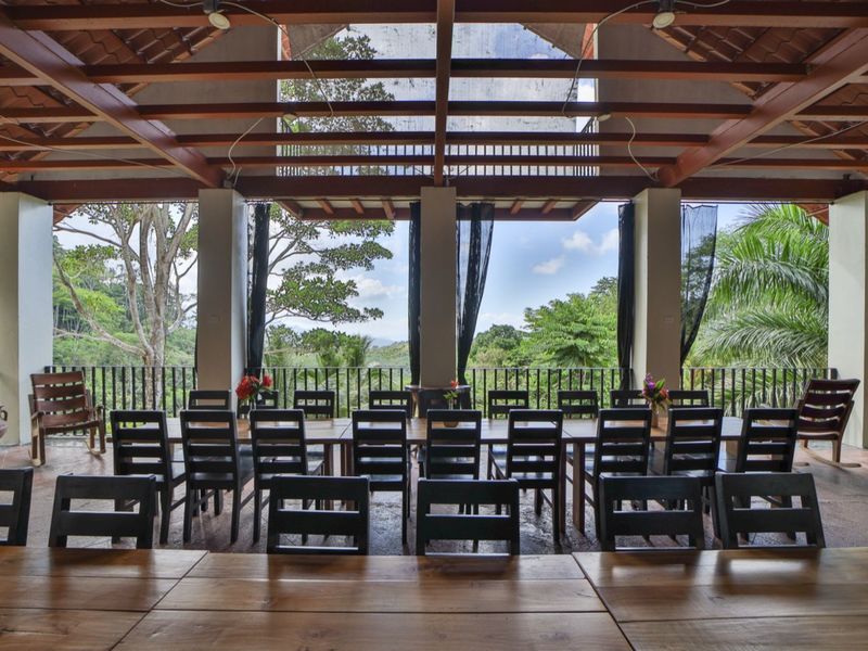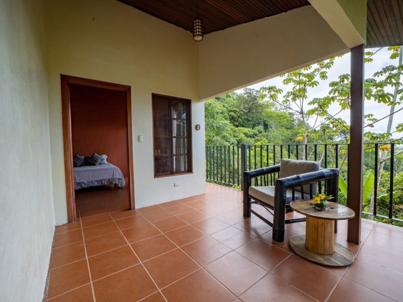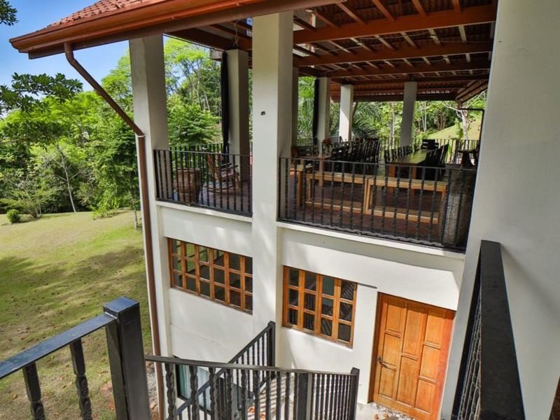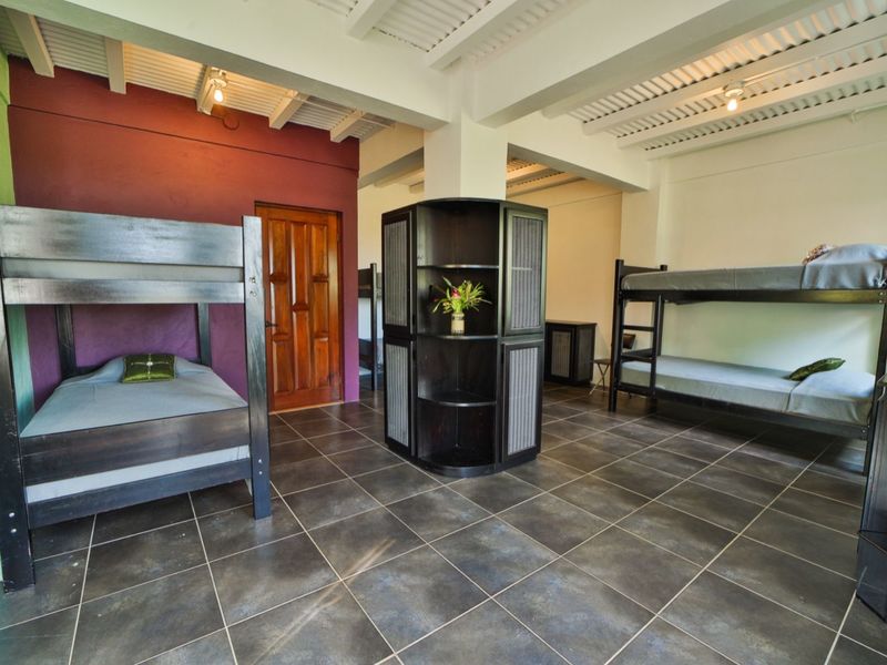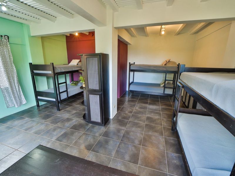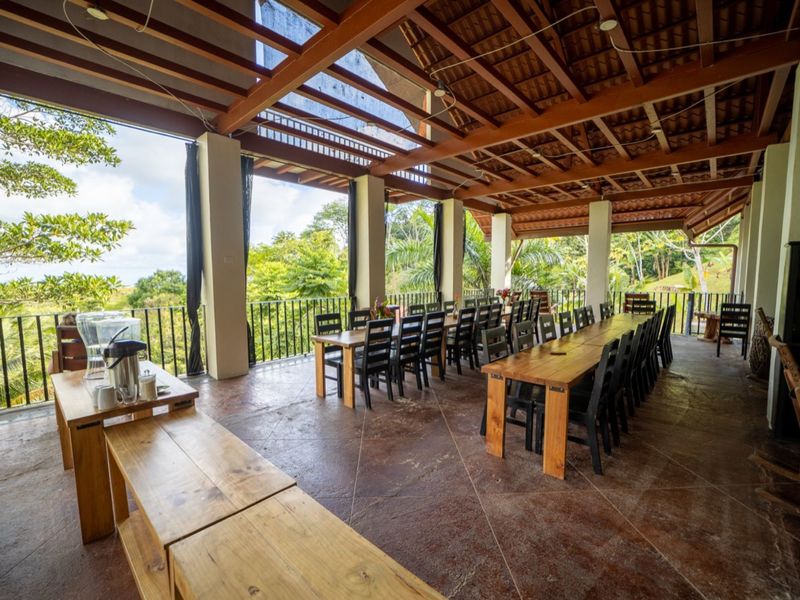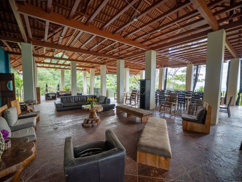 The main building is an impressive 3+ story concrete and steel structure. One level features offices, storage rooms, a fully-equipped commercial kitchen, and an open-air gathering and dining area that make this property perfectly set up for hosting group retreats. In the dining area is plenty of space for large groups, with two banquet-length custom tables, which can provide also workspace while enjoying views of the ocean and jungle. The second level offers 2 large dormitory-style rooms which can accommodate up to 6 people, and each of the two includes a full bathroom.