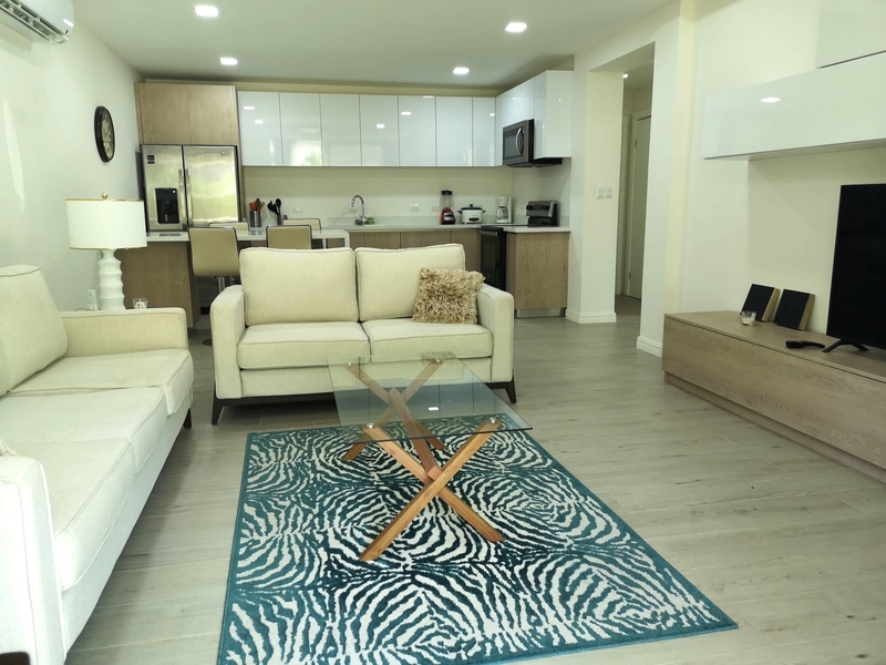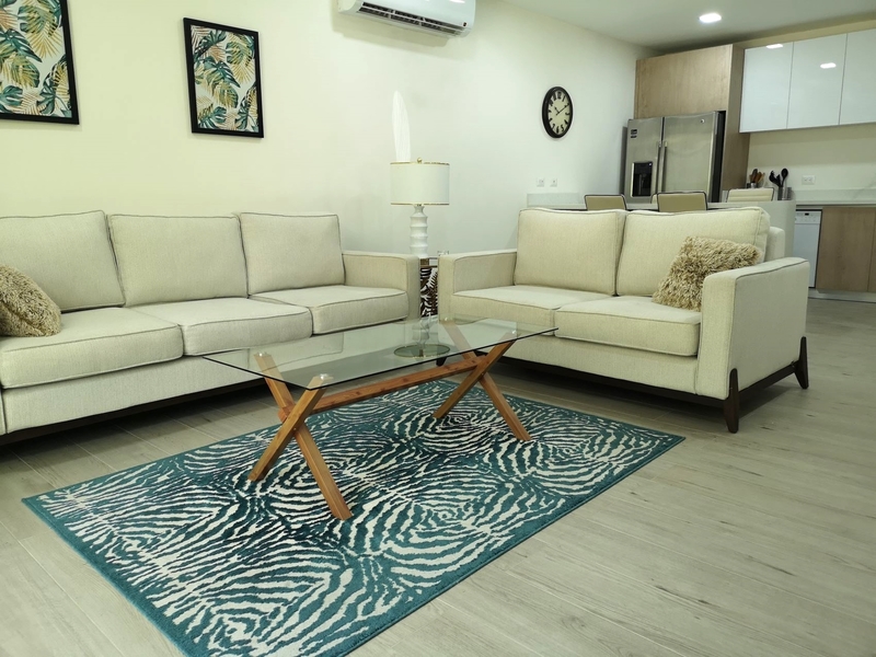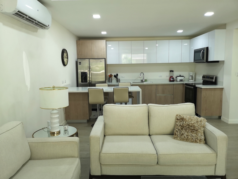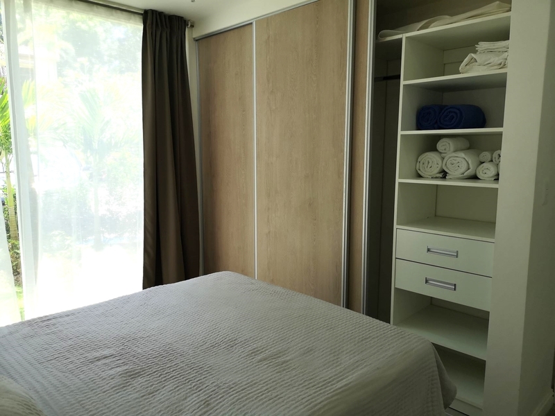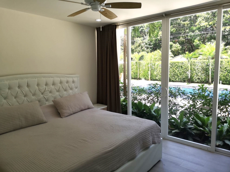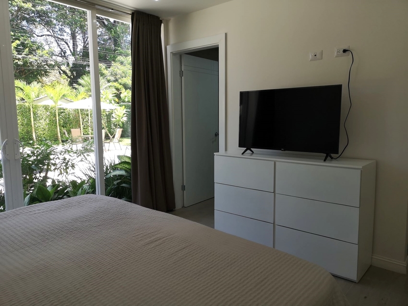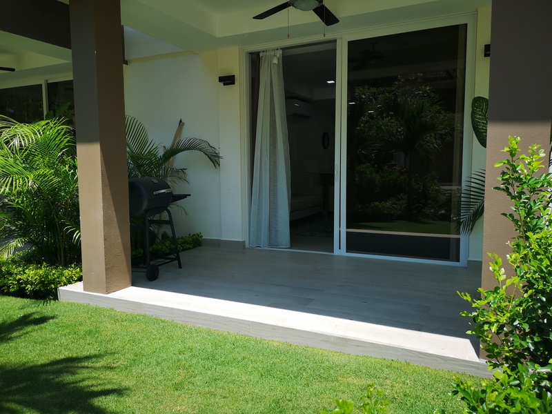 The two apartments currently on the market are located on the ground floor with direct access to the pool area. The cream-colored walls and ceramic floors give these condominiums a welcoming warmth that’s complemented by elegant beige tones of the furniture and the detailing. The layout opens from the dining and living room directly onto the outdoor terrace and the BBQ and kitchen area. The master bedroom with a spacious bathroom and walk in closet space, offers direct view of the pool area. The guest bedroom has a queen size bed, a spacious closet wall and views of the garden. The condo has an additional guest bathroom, as well as a storage room with washing machines. All rooms feature ceiling fans and air conditioning.