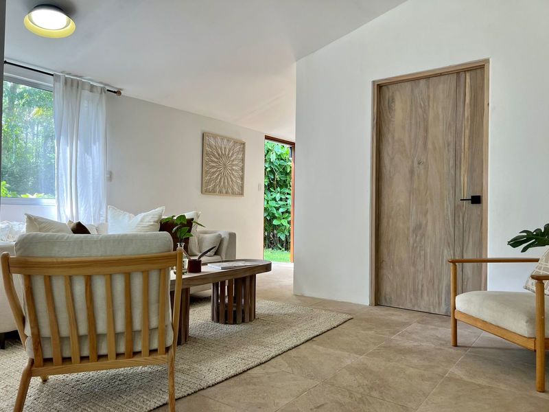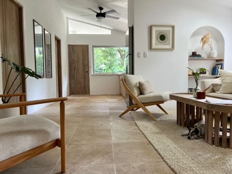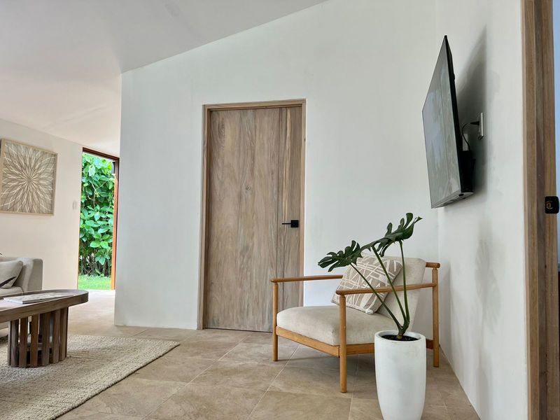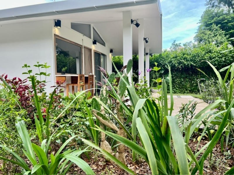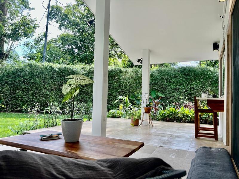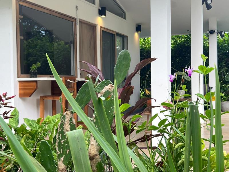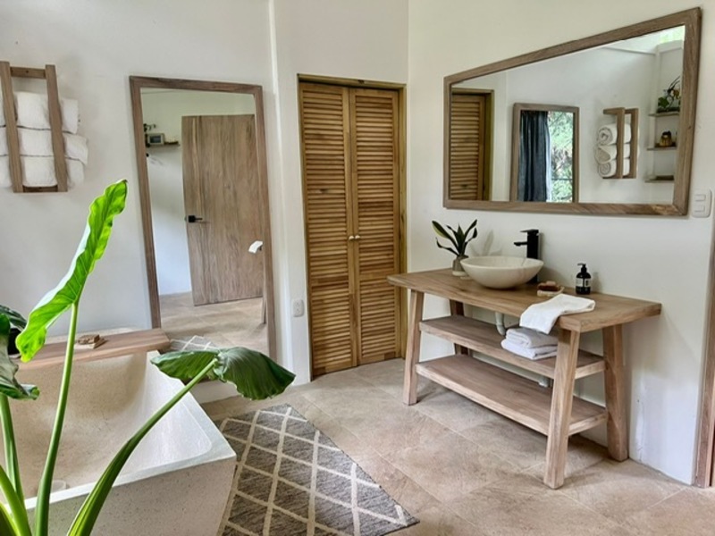 Moving on to practicalities, Little Garden Finca is fully equipped to meet all your needs. The kitchen appliances are brand new, making cooking a breeze. The custom Guanacaste cabinets add both style and storage space. In the bathroom, the generously sized stone tub imported from Indonesia and high-quality fixtures provide a spa-like experience that you'll fall in love with. Additionally, the house comes with a washer and dryer, air conditioning, and ample owner storage for your convenience.