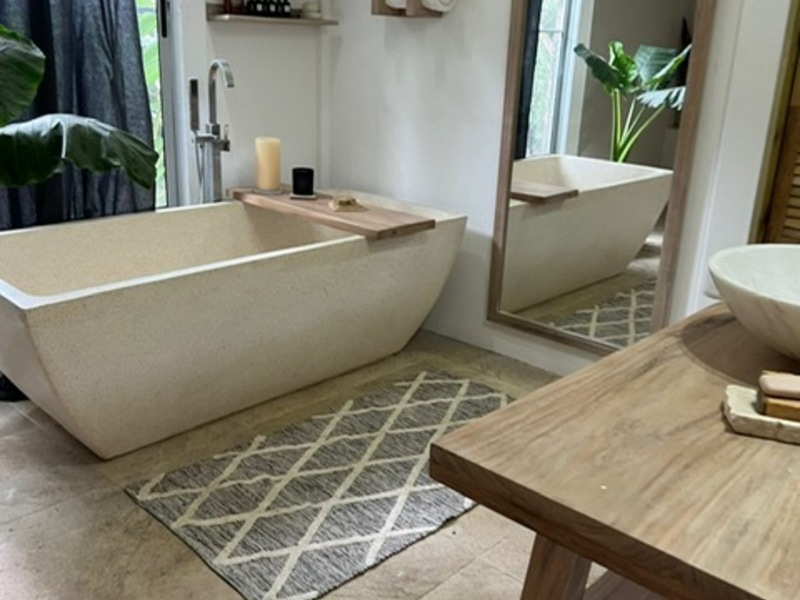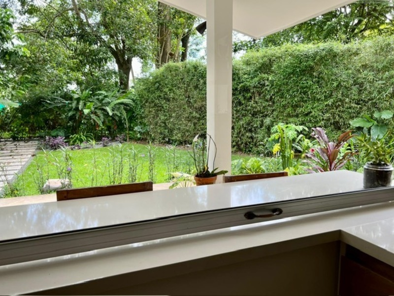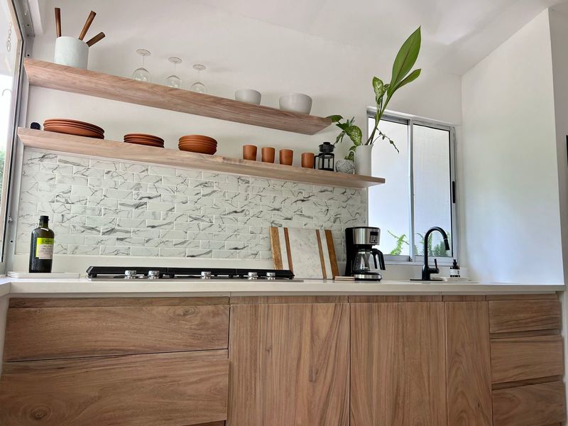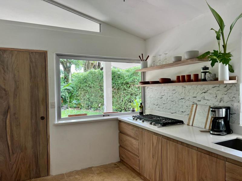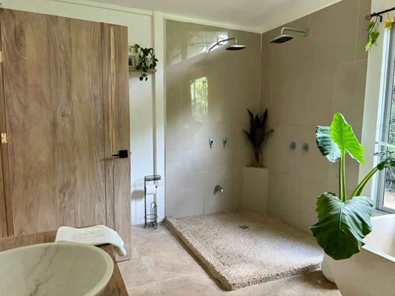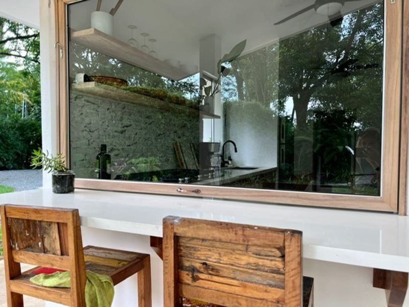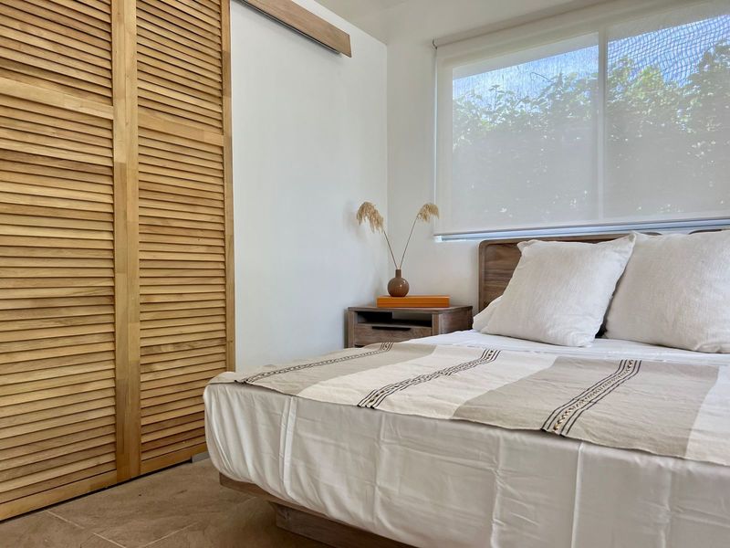 Moving on to practicalities, Little Garden Finca is fully equipped to meet all your needs. The kitchen appliances are brand new, making cooking a breeze. The custom Guanacaste cabinets add both style and storage space. In the bathroom, the generously sized stone tub imported from Indonesia and high-quality fixtures provide a spa-like experience that you'll fall in love with. Additionally, the house comes with a washer and dryer, air conditioning, and ample owner storage for your convenience.