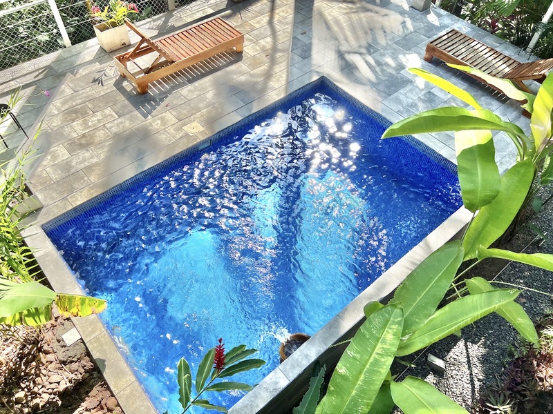 The pool & entertainment area is located 1 level below which is accessed through an internal “open aire” stairway. The pool area is elevated off the ground with a tile pool deck and overlooks a seasonal creek below.