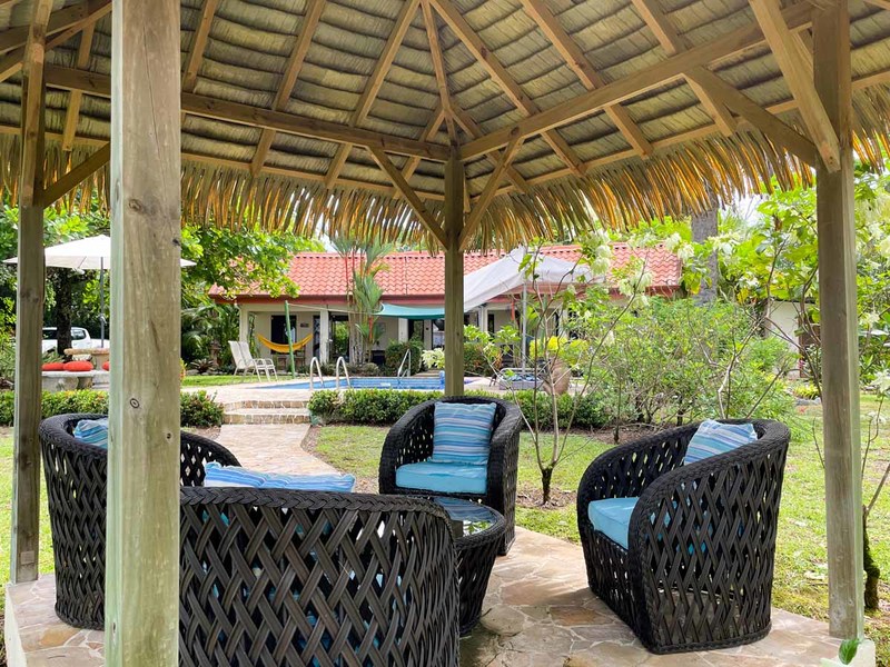 The house construction features two ensuite bedrooms on either wing of the long and narrow structure, split in the middle by the indoor kitchen and two outdoor living areas. On one side of the kitchen is a covered dining area with a bbq grill, and on the other is a covered terrace with seating that faces the large pool and amazing ocean view. This house does not have an indoor living area but this can be remedied with the simple addition of three walls where the dining area is currently located. There is ample space in this area behind the house to build a quite sizable additional room.