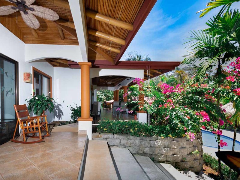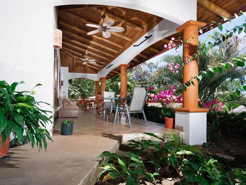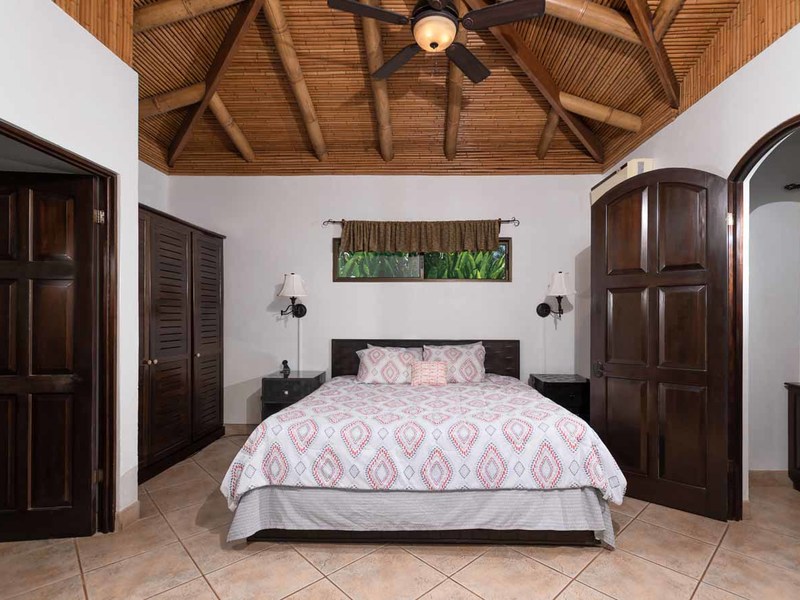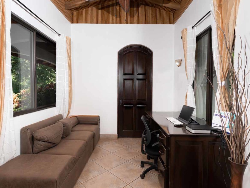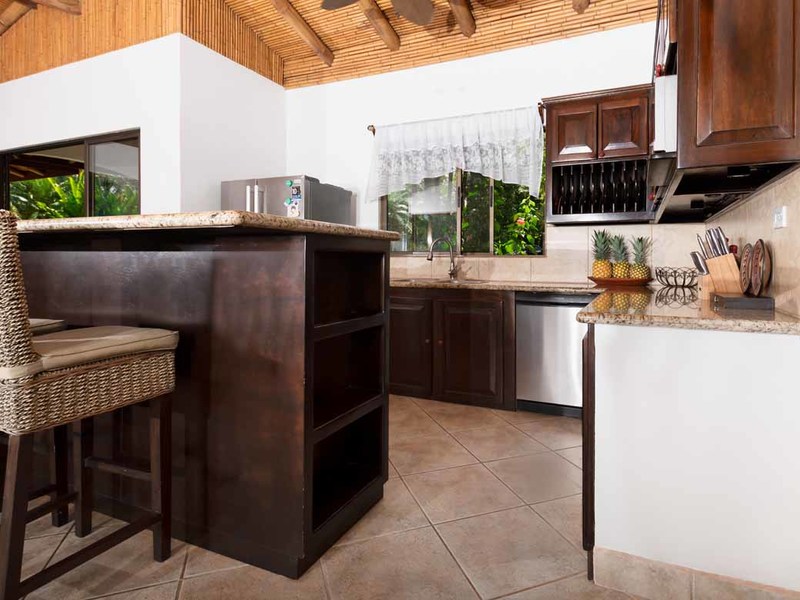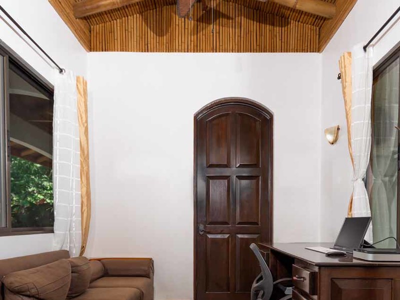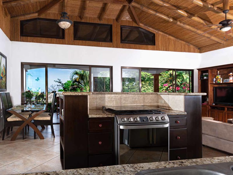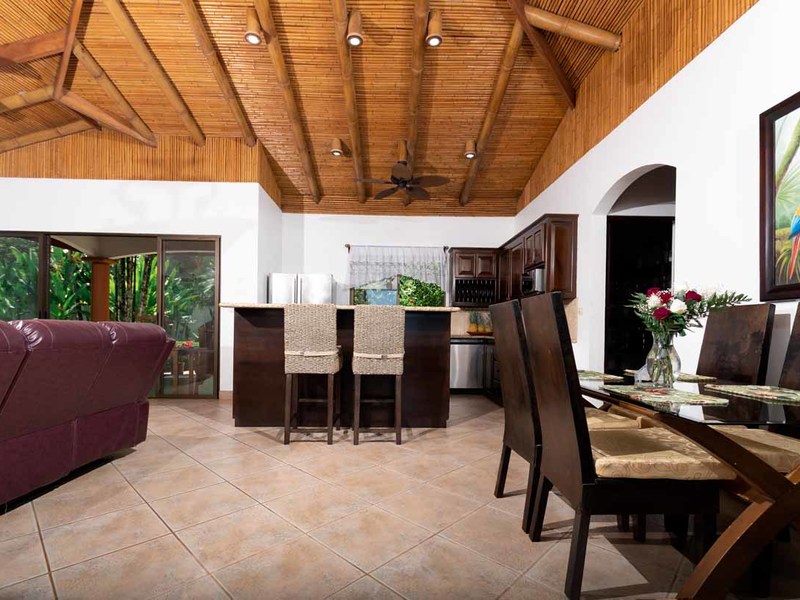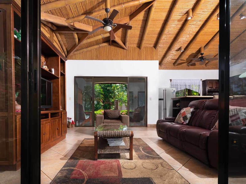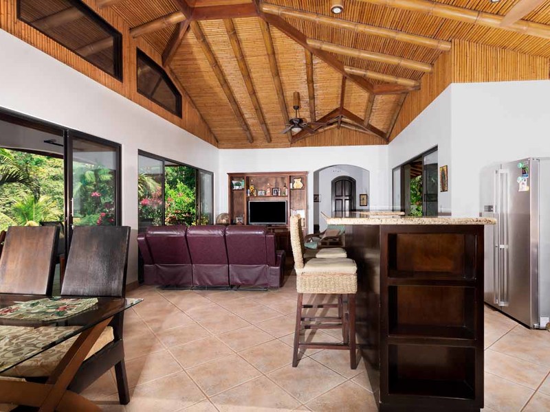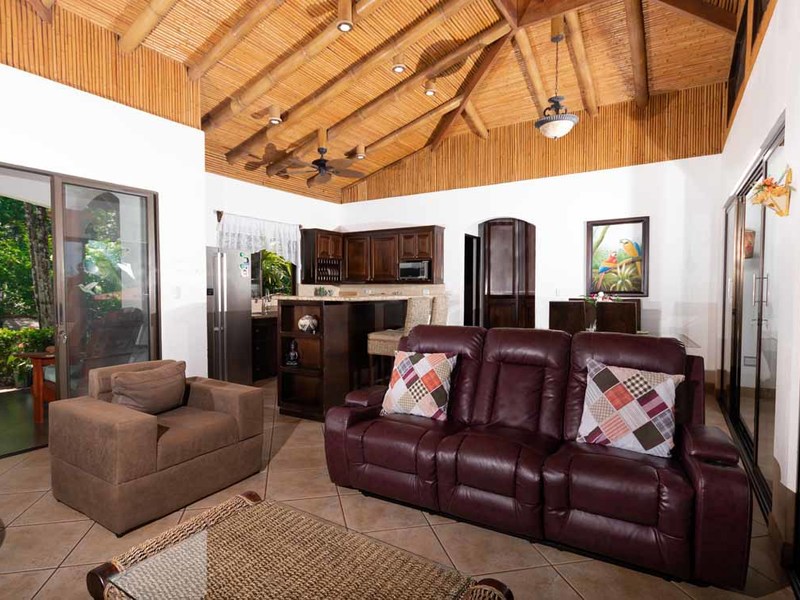The one-bedroom, two-bathroom home estate is surrounded by lush greenery and beautiful scenery. As you enter the home, you are greeted by an open-concept living room, dining room, and kitchen with an amazingly high ceiling made out of treated bamboo. The living room is spacious, with large sliding doors that let in plenty of natural light, and it features a comfortable sofa and chairs, a coffee table, and a flat-screen TV. Yes, much of the furniture is included, so move right in! The dining area has a wooden table with chairs, and the kitchen is fully equipped with modern appliances and plenty of counter space. The living room then leads out to the covered terrace and pool.