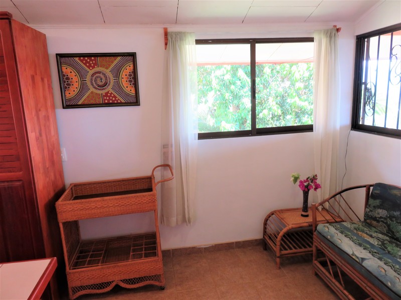The outside patio, adorned with tiles, offers a picturesque view of the expansive garden at Casa Aracari. Stepping inside from the patio, you'll find yourself in a welcoming living room and kitchen area. The kitchen boasts a convenient built-in breakfast bar with stools, a 4-burner electric stove/oven, a single-door fridge/freezer, and a microwave cleverly integrated into the wooden wall shelving. As you enter through the front door, to the left you'll discover two bedrooms and a bathroom.