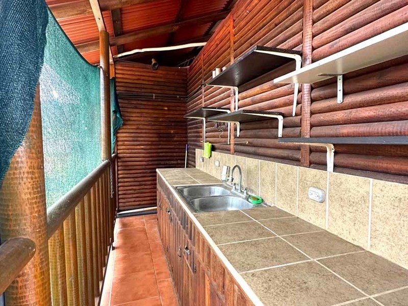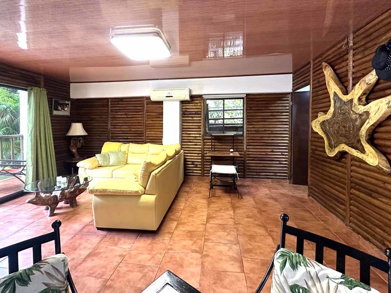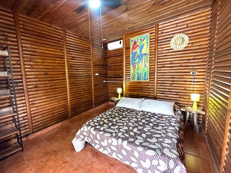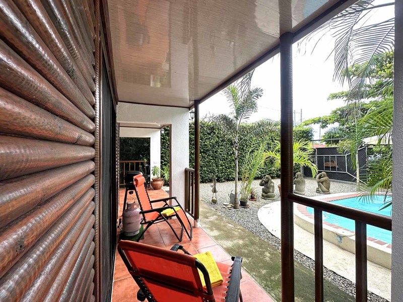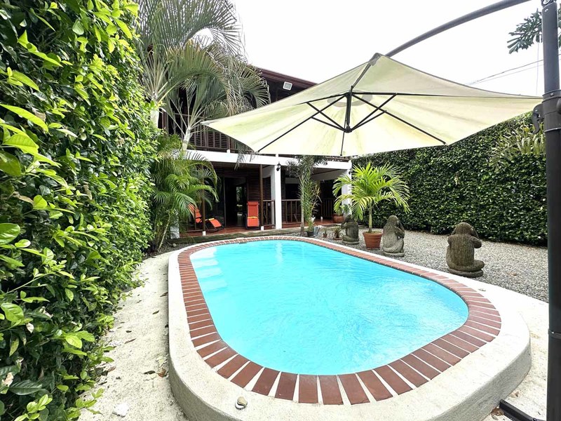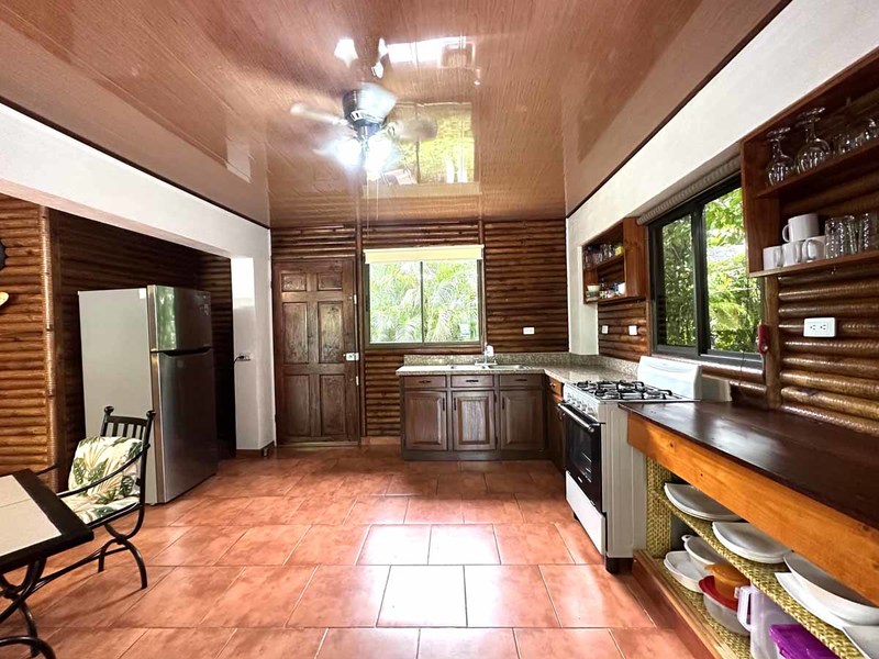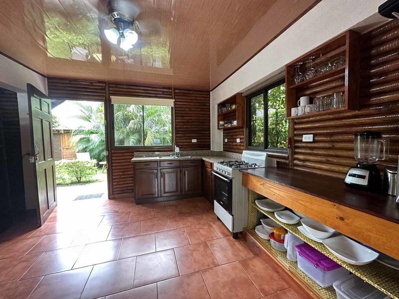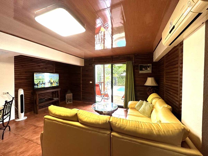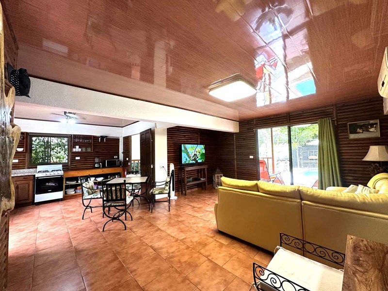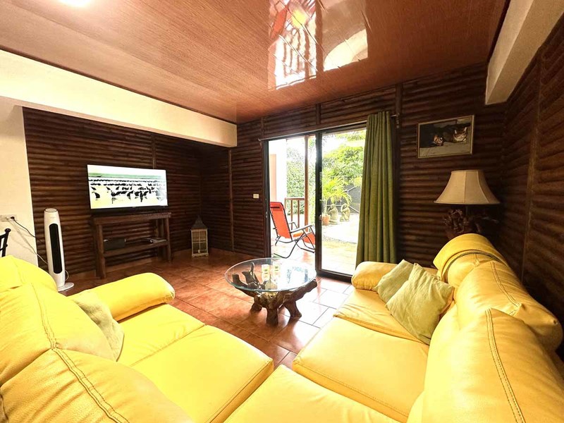 This two-bedroom, two-bathroom home is situated on an expansive plot of land filled with tropical flowers and trees. The interior features walls made from teak wood, which gives it a warm and inviting feel. In addition to its open floor plan, there is also an outdoor balcony that overlooks the mountains, providing additional space for entertaining or relaxing. The kitchen area is modernly designed and comes equipped with stainless steel appliances and plenty of counter space. Lastly, there is a pool area where guests can cool off during hot days or take a dip after a long day of exploring the area.