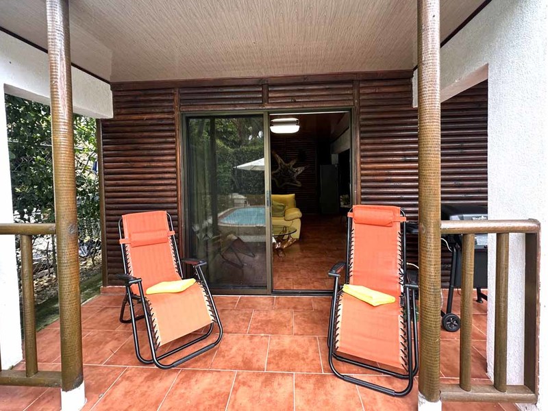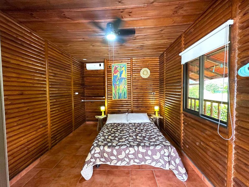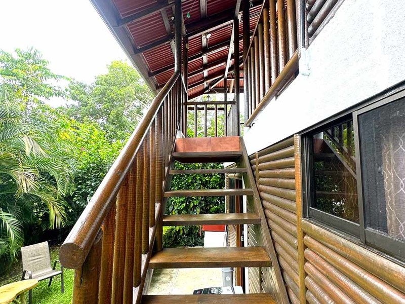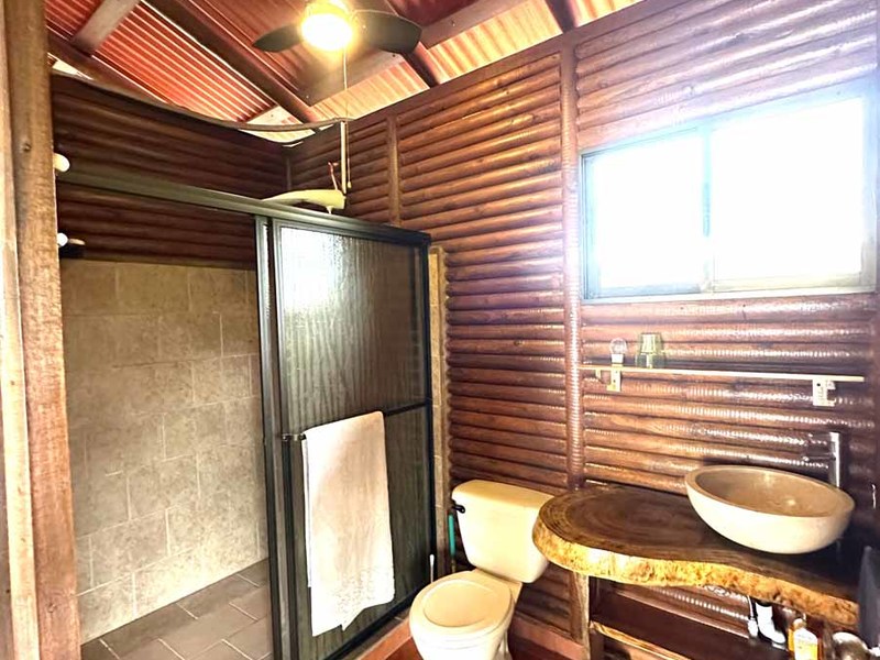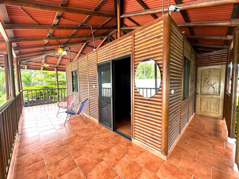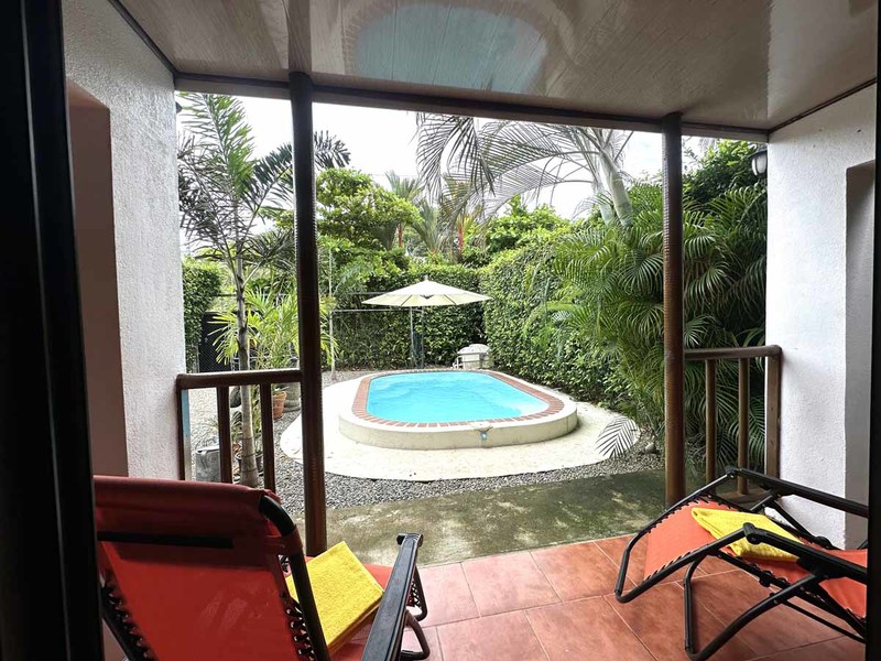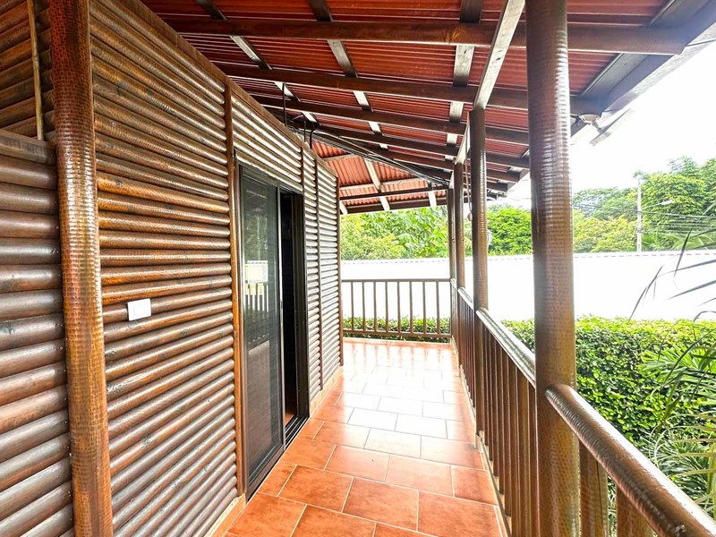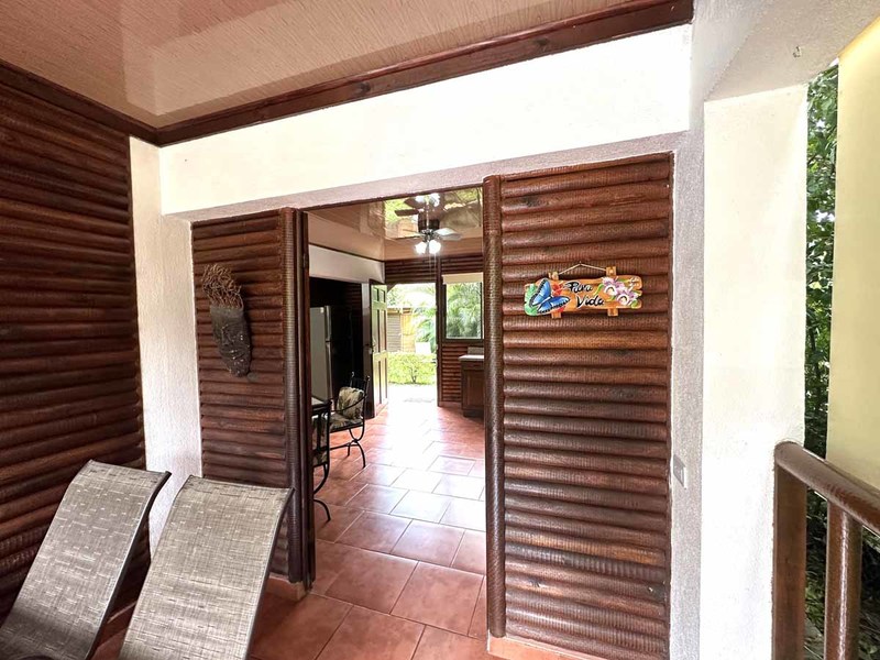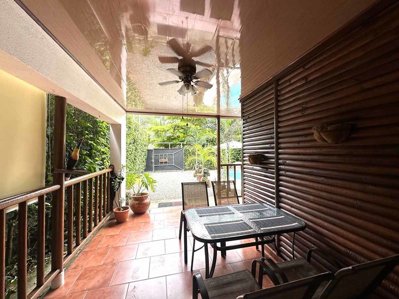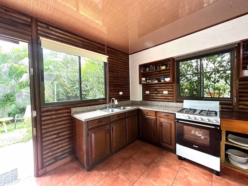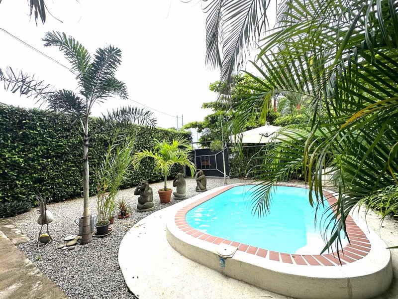This two-bedroom, two-bathroom home is situated on an expansive plot of land filled with tropical flowers and trees. The interior features walls made from teak wood, which gives it a warm and inviting feel. In addition to its open floor plan, there is also an outdoor balcony that overlooks the mountains, providing additional space for entertaining or relaxing. The kitchen area is modernly designed and comes equipped with stainless steel appliances and plenty of counter space. Lastly, there is a pool area where guests can cool off during hot days or take a dip after a long day of exploring the area.