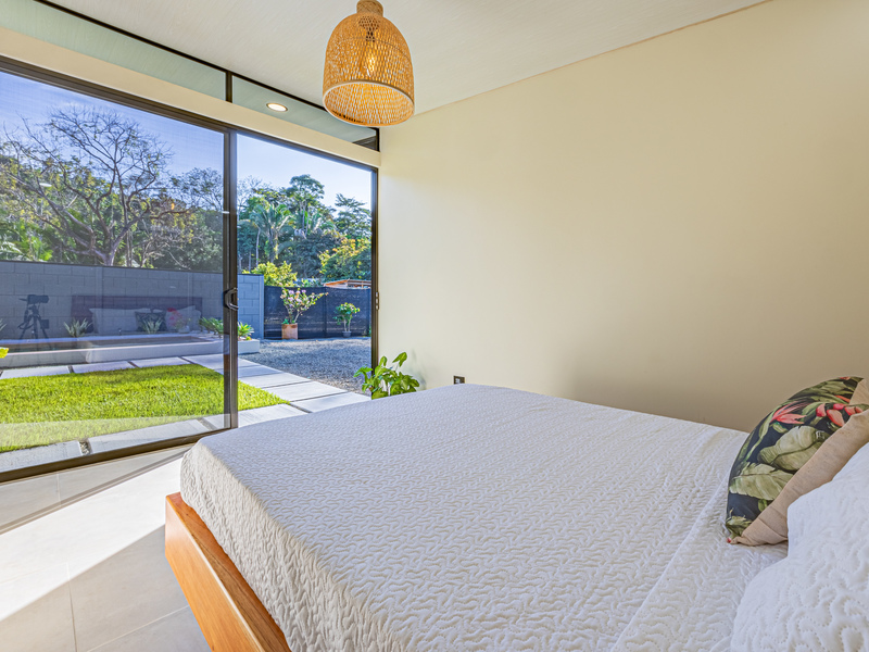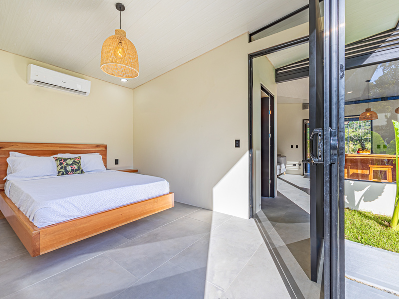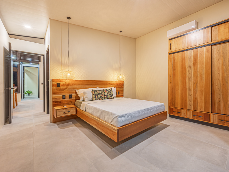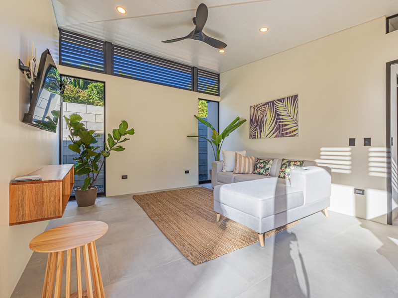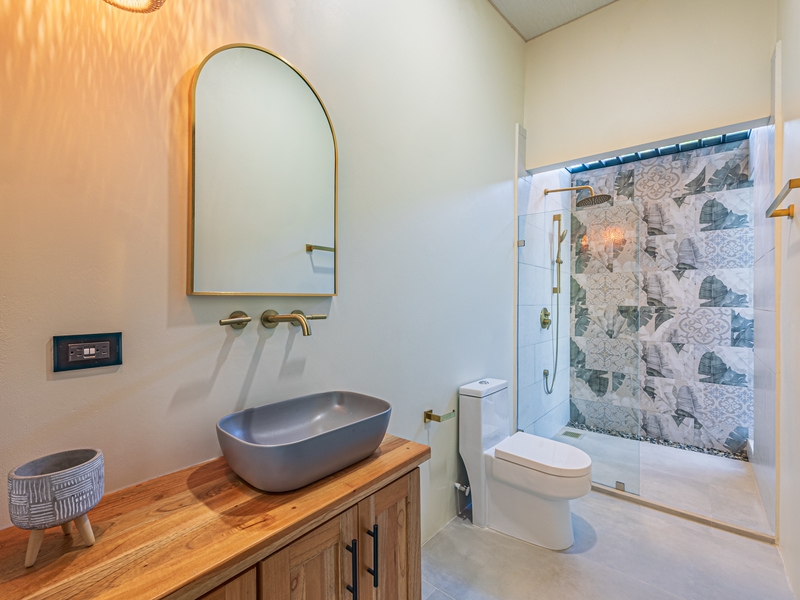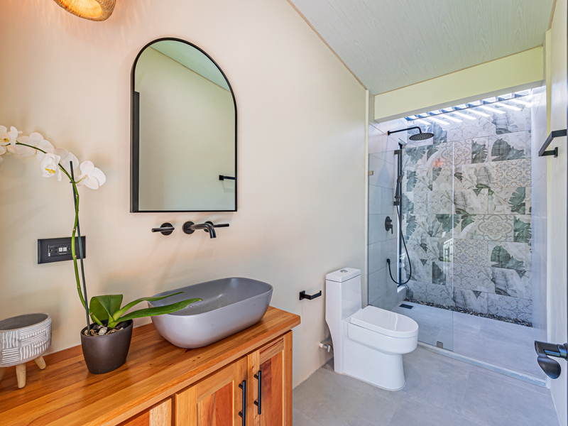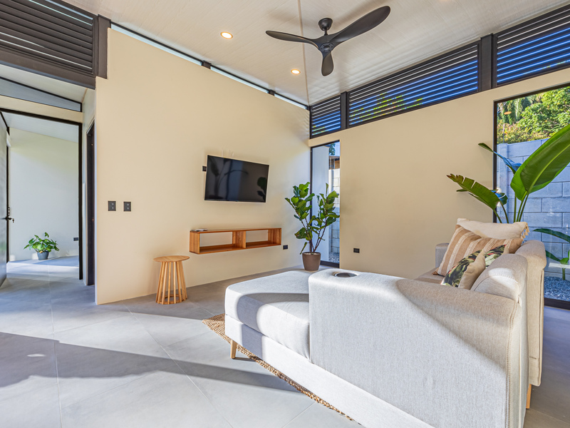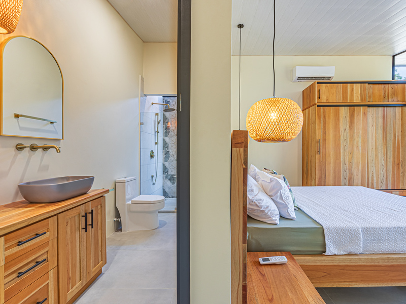 The master bedroom will feature its own stylish ensuite bathroom, offering a private retreat for relaxation and rejuvenation. The suite features large glass windows that will provide an abundance of natural light and offer views of the surrounding tropical landscape. The solid concrete construction and high ceilings will contribute to a fresh and comfortable atmosphere throughout the house, giving you the impression of a much larger space.