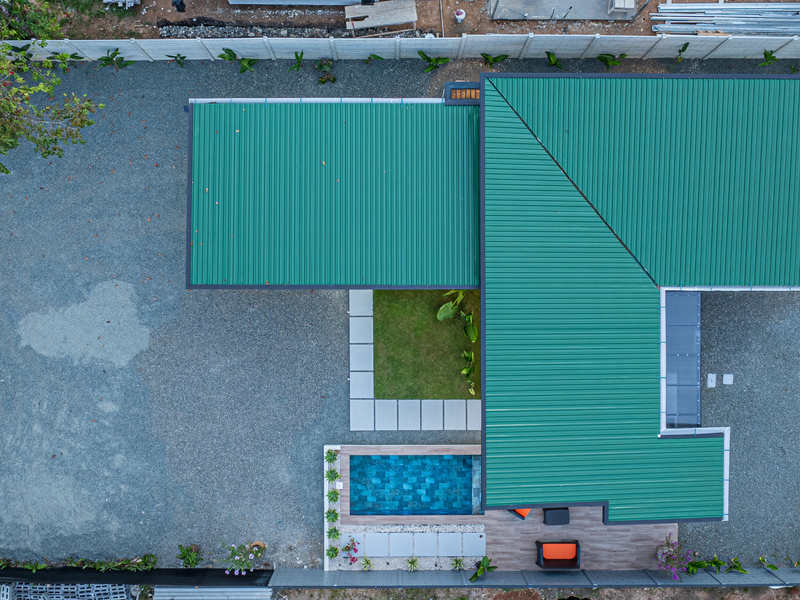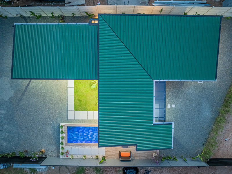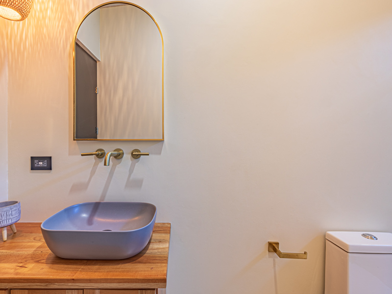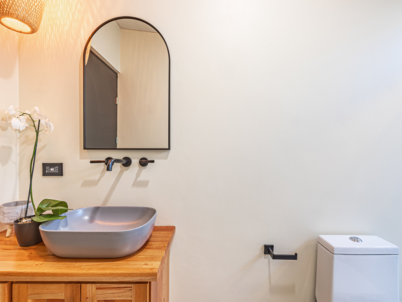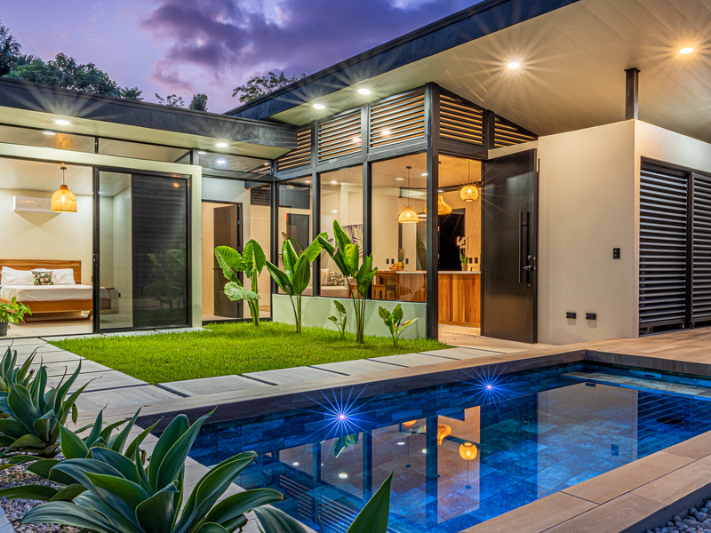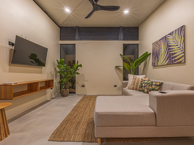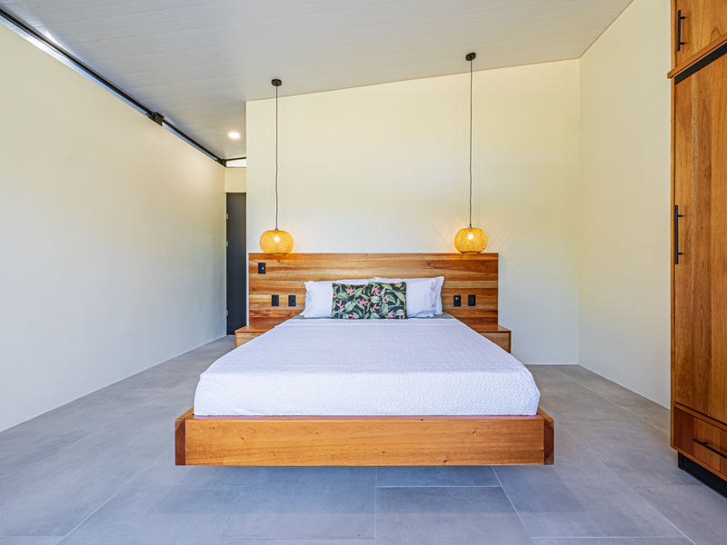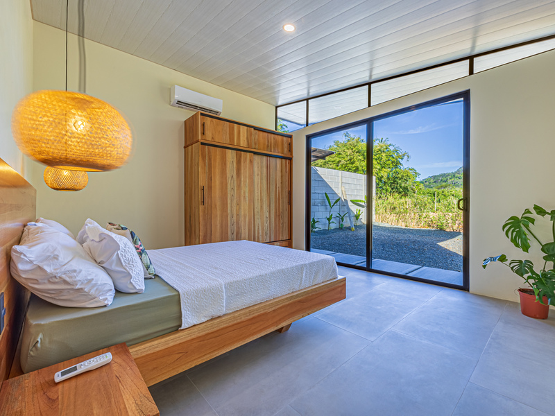 The master bedroom will feature its own stylish ensuite bathroom, offering a private retreat for relaxation and rejuvenation. The suite features large glass windows that will provide an abundance of natural light and offer views of the surrounding tropical landscape. The solid concrete construction and high ceilings will contribute to a fresh and comfortable atmosphere throughout the house, giving you the impression of a much larger space.