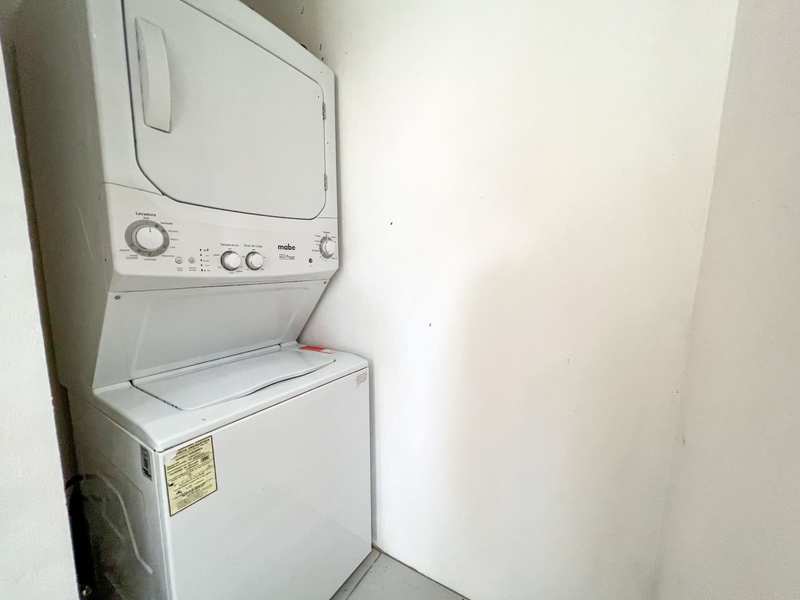 Conveniently located next to the kitchen is the area with a stacked washer and dryer.
