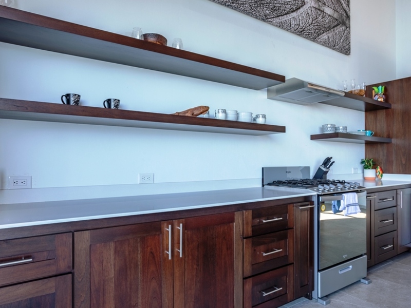 The heart of the home is undoubtedly the living room and kitchen area. Opening up the doors on both sides reveals a view of the pool and surroundings making it an exceptional spot to relax and take in the picturesque country scenery. The TV area offers sofas for lounging while the kitchen is expansive and open. Adorned with White Quartz countertops, cedar cabinets, and floating shelves the kitchen exudes elegance. The expansive island provides a view that adds to its allure.