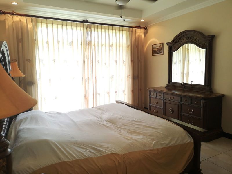 The open plan fully equipped kitchen with tropical wood cabinets, breakfast bar with granite countertop is part of the living- dining room area. All rooms have garden view. The home features lofty ceilings with bamboo accents, ceiling ventilators, teak wood floors, Spanish tile porcelain floors, and AC through the entire unit. Close by set in the well-maintained grounds are the common swimming pools with sun chairs and relaxing area. The Del Pacifico condo projects have 24 hours security.