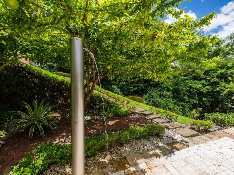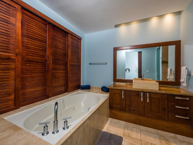 The first story has a fully-equipped kitchen with high-end, stainless-steel appliances, granite countertops, and loads of custom-built, hardwood cabinets. The open-concept floor plan flows seamlessly into the fully-furnished living and dining rooms. A powder room nearby is handy for guests. There are patio doors off the living and dining room that open to a large covered terrace with plenty of space to soak up the amazing views and fresh Costa Rican air.
