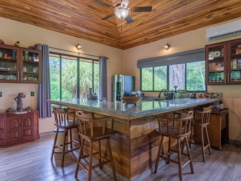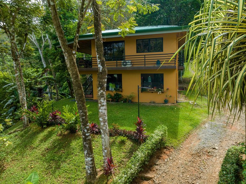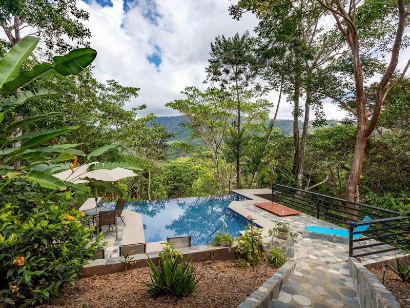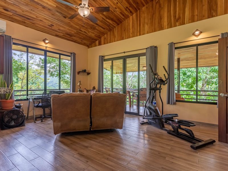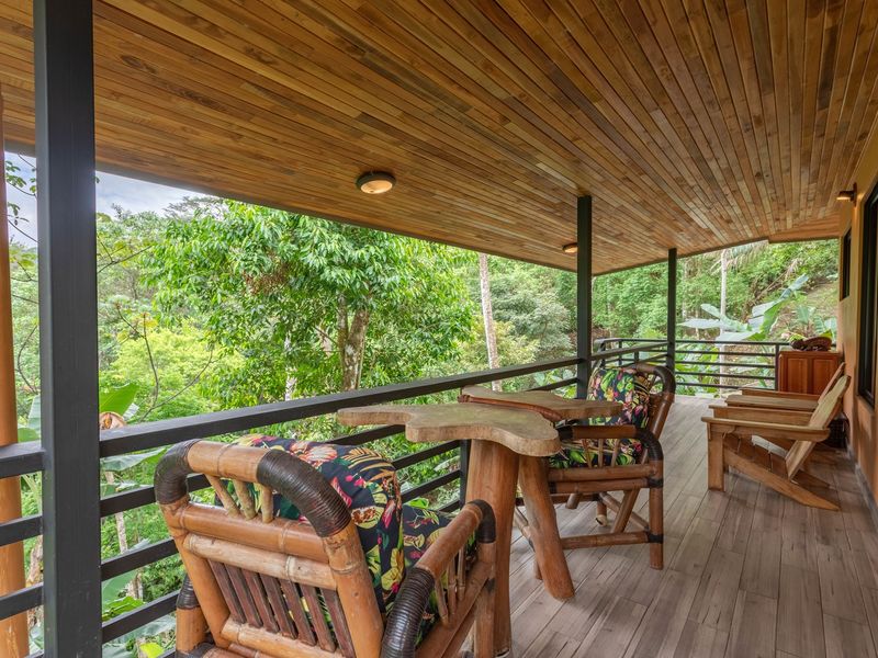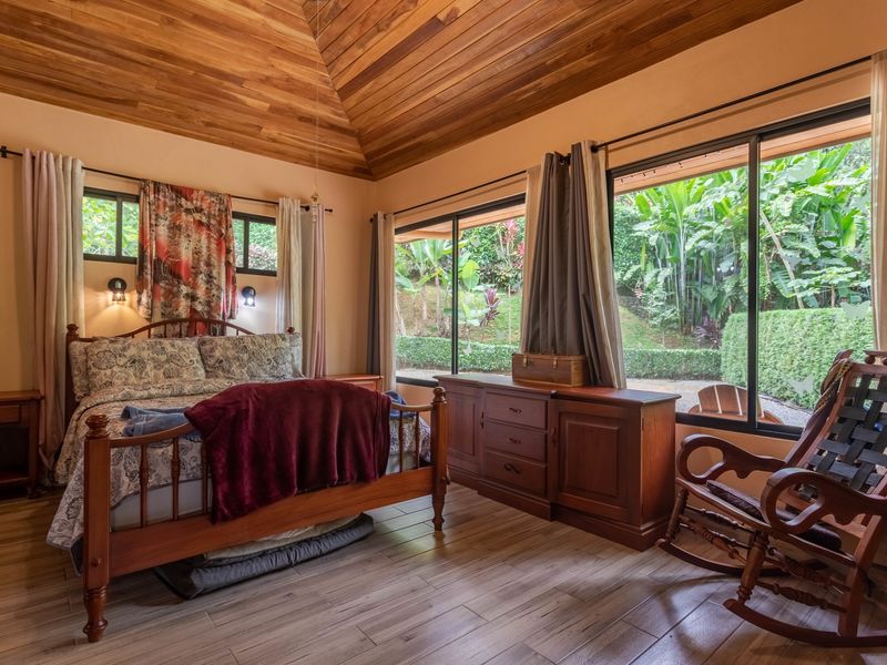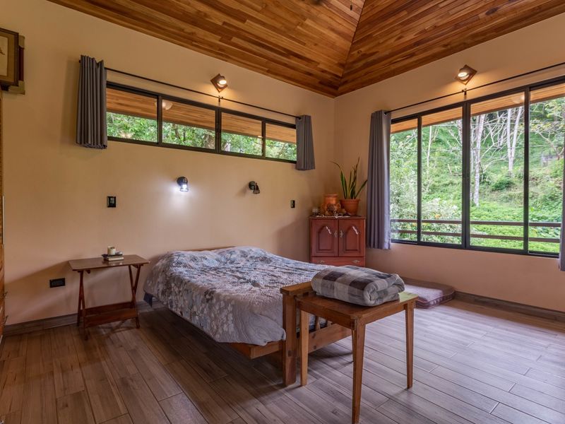 The structures are built with sturdy concrete block masonry, exotic hardwoods and durable four-pitch, metal roofs. The immediate area is home to other, well-valued expat homes, and the location is only 15 minutes to the town of Dominical. The main house is very tasteful and features an open concept (great room with half bath) with vaulted ceilings and bedroom suites on either side. There is an expansive covered terrace which allows for great outdoor living and the focal point is a T-shaped pool with views of the surrounding forest.