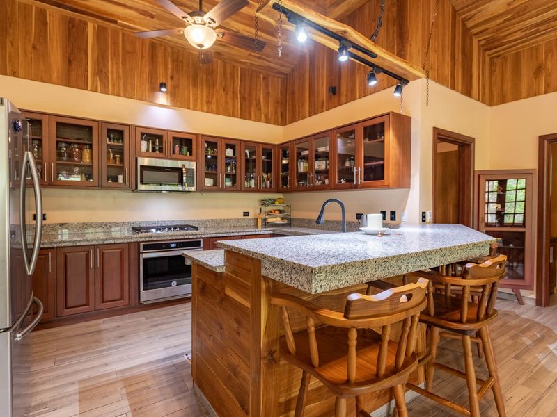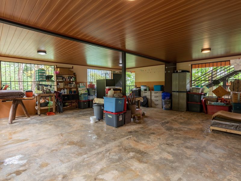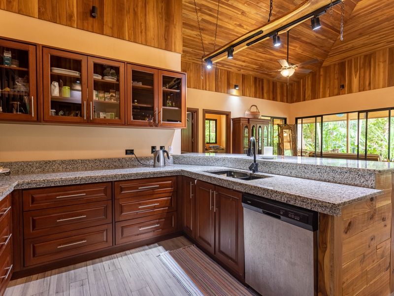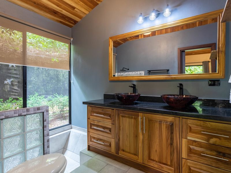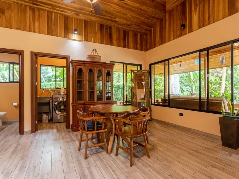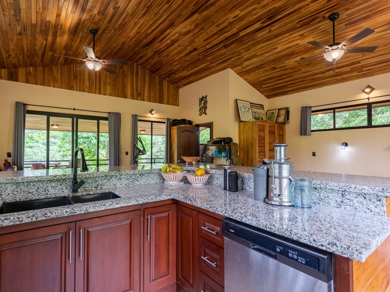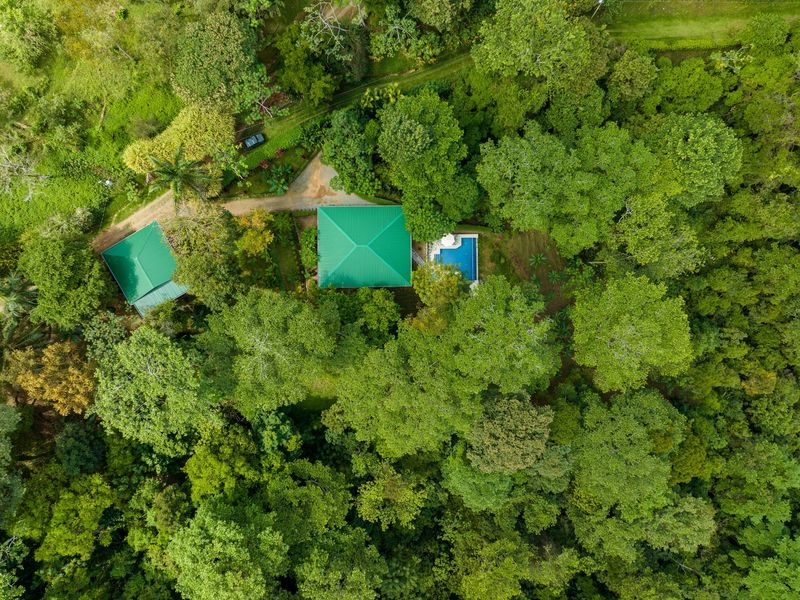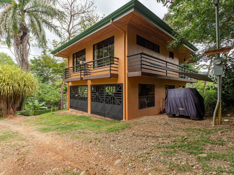 The structures are built with sturdy concrete block masonry, exotic hardwoods and durable four-pitch, metal roofs. The immediate area is home to other, well-valued expat homes, and the location is only 15 minutes to the town of Dominical. The main house is very tasteful and features an open concept (great room with half bath) with vaulted ceilings and bedroom suites on either side. There is an expansive covered terrace which allows for great outdoor living and the focal point is a T-shaped pool with views of the surrounding forest.