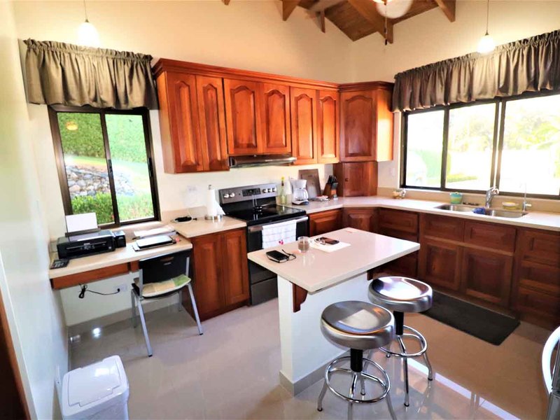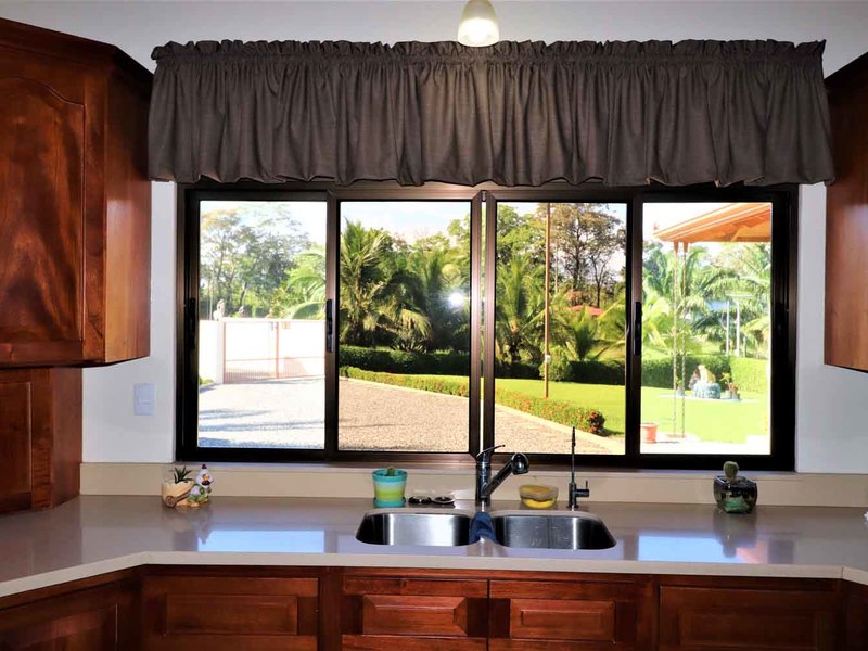 The kitchen is spacious and it is equipped with furniture designed to be functional. It has large windows that allow natural light to enter,