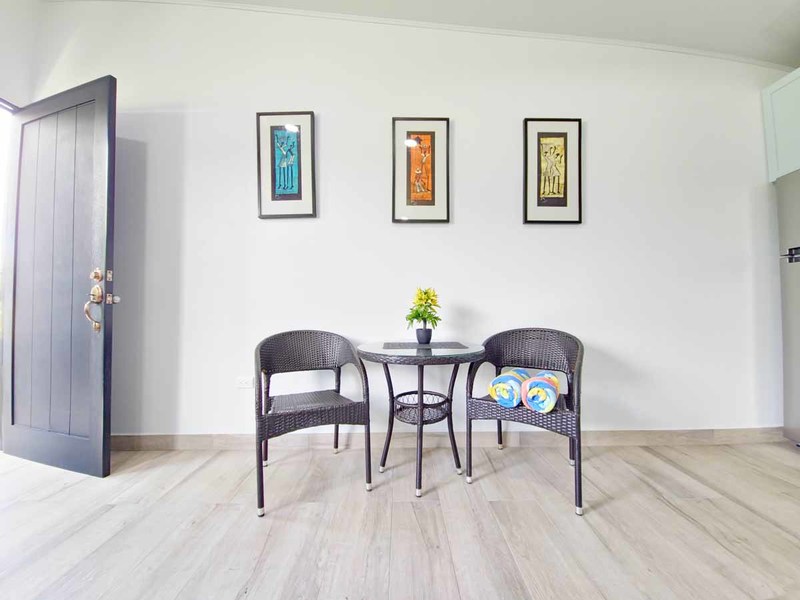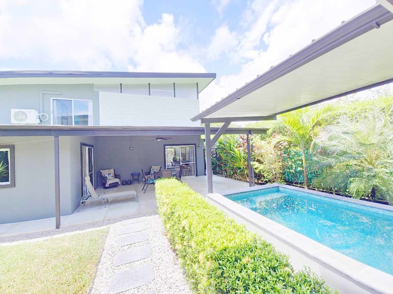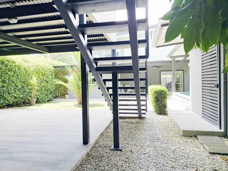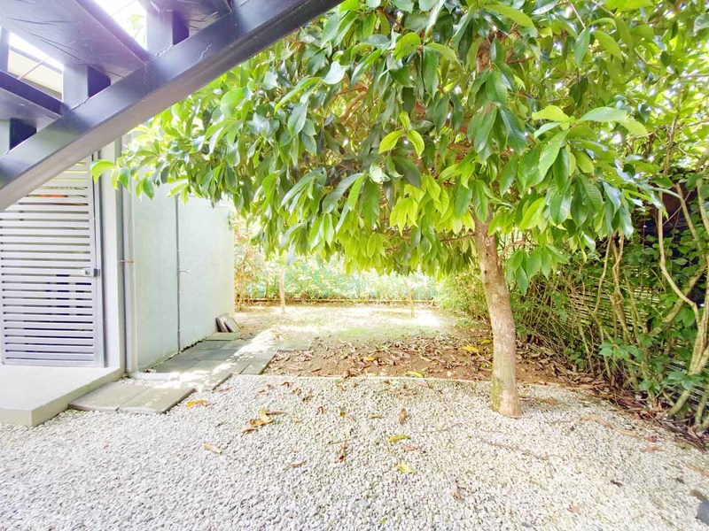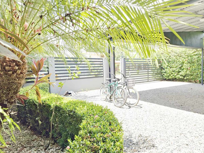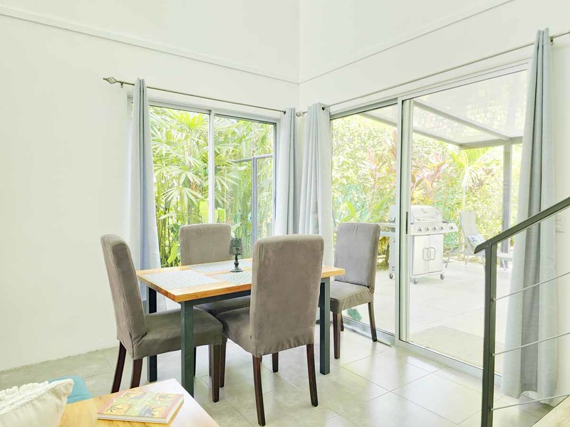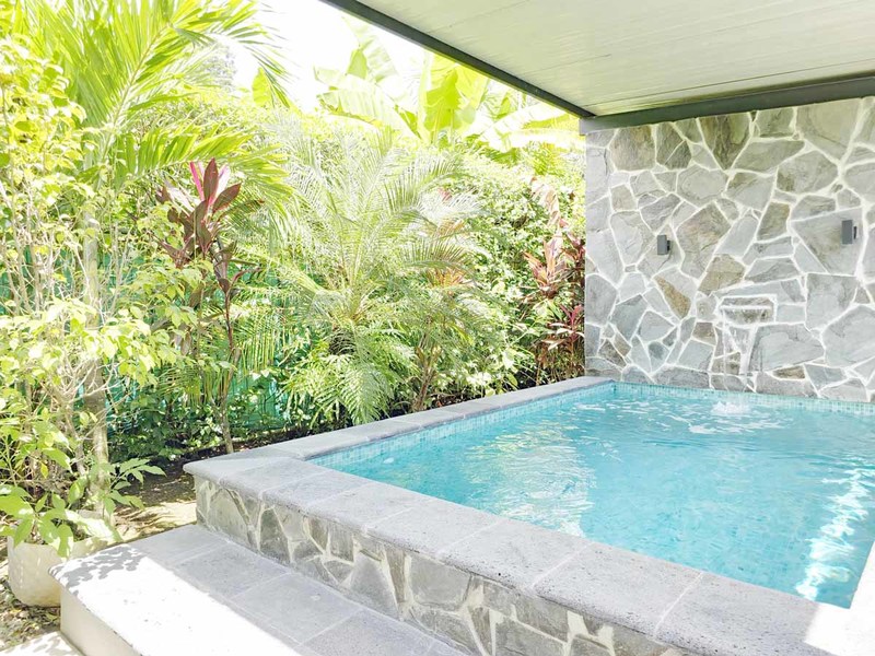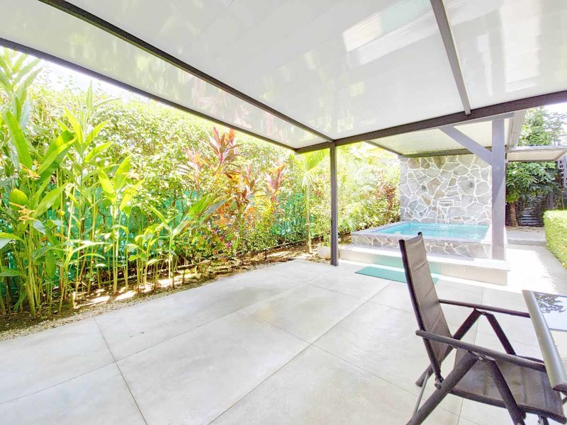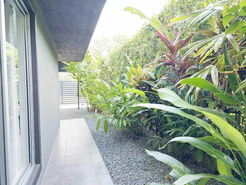 This picturesque abode is situated on a spacious 500 m2 lot and boasts a welcoming living room with direct access to a delightful terrace, a lovely pool, and an immaculate, fully landscaped garden with covered parking for two vehicles. The property also features two cozy bedrooms with sliding doors that effortlessly transition to the outdoor space, as well as an air-conditioned kitchen replete with teak wood cabinets, polished concrete countertops, and state-of-the-art appliances. A mezzanine master bedroom crowns the property, ensuring a private retreat for the new owner.
