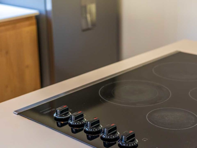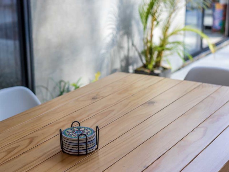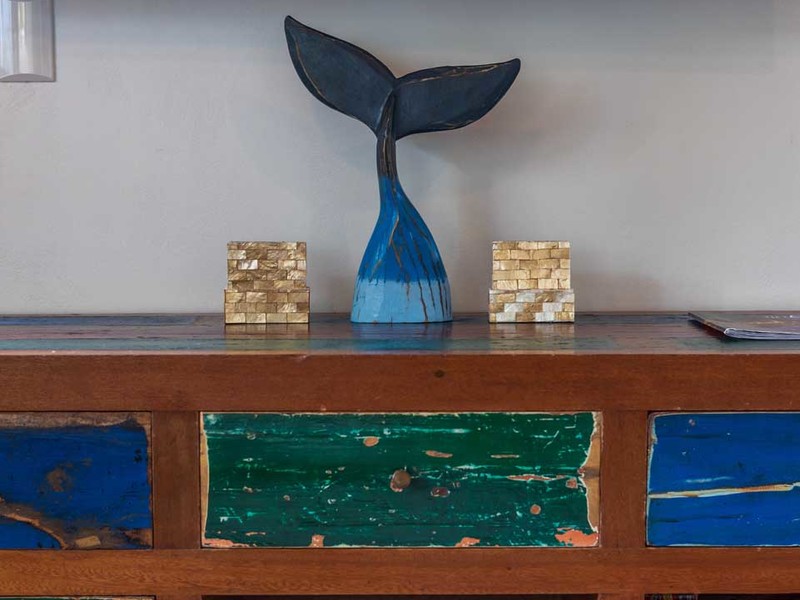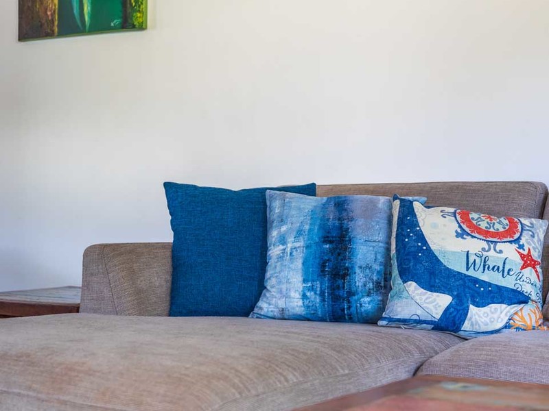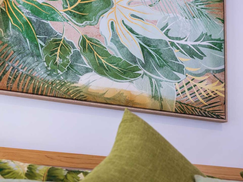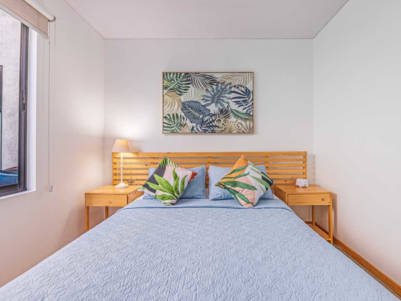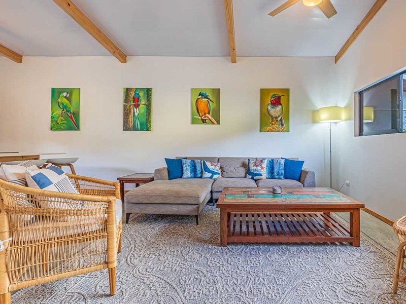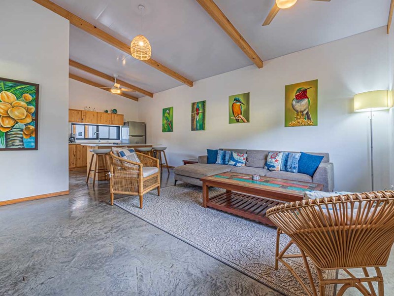 Upon opening the door you'll be greeted by an open-concept living and kitchen area adorned with exquisite furniture imported from Bali. The walls feature art that adds to the charm of the space. The equipped kitchen is perfect for creating memories, with loved ones. The harmonious combination of quartz and wooden accents creates a warm and inviting ambiance. Positioned strategically between the kitchen and bedrooms the living room provides added privacy to both areas.