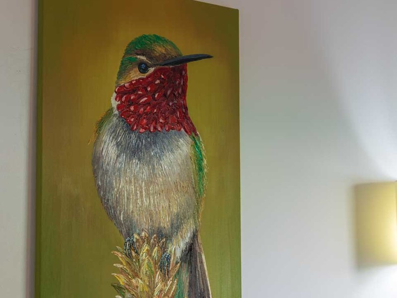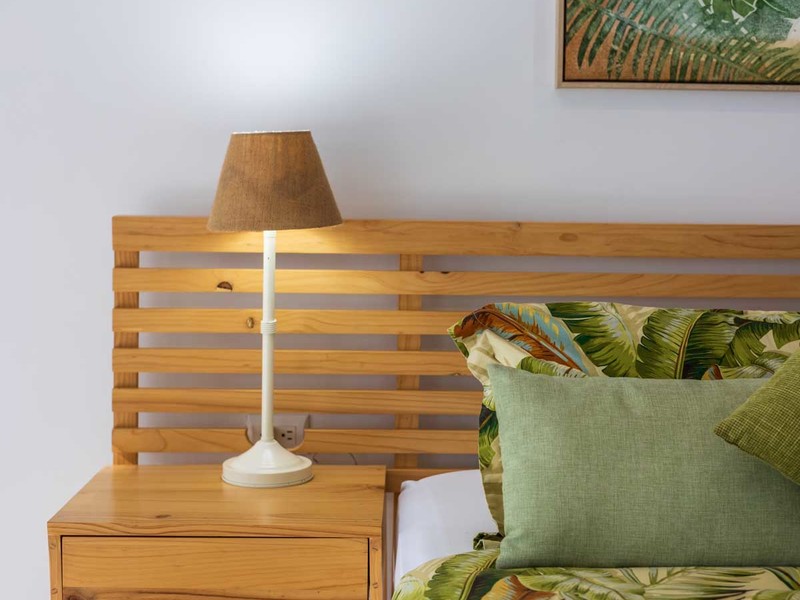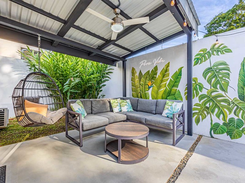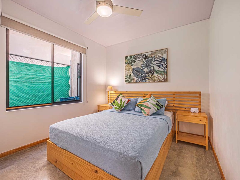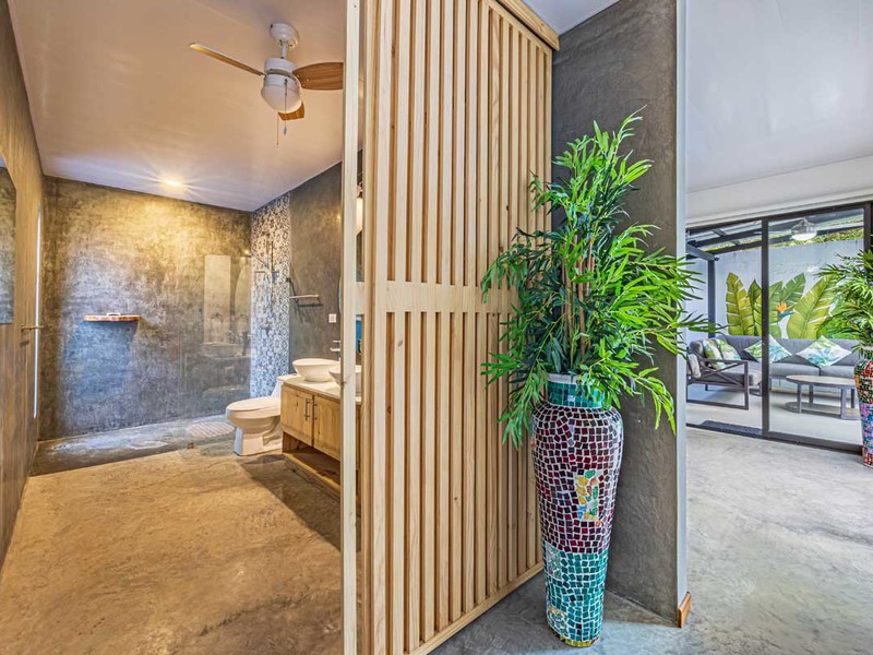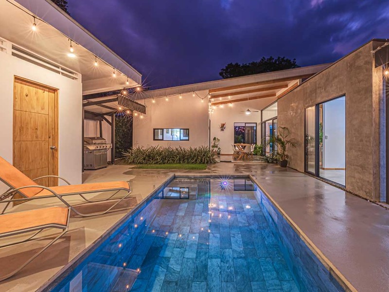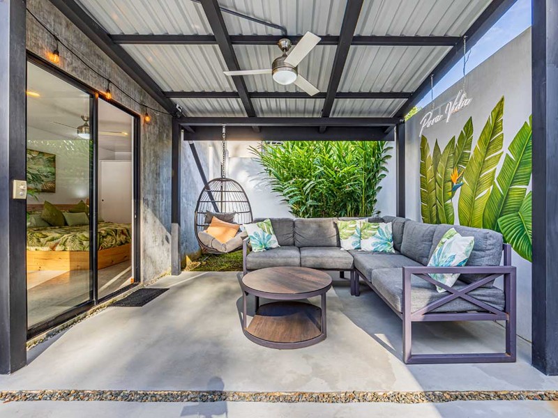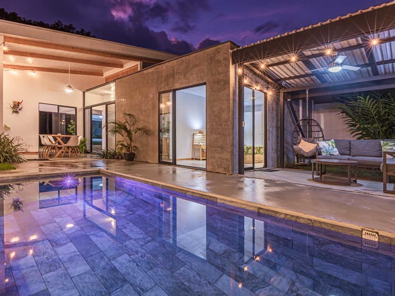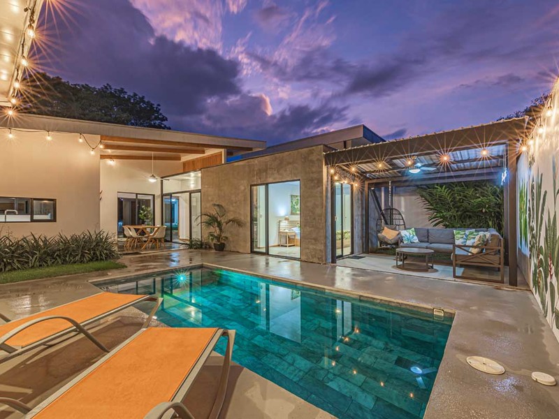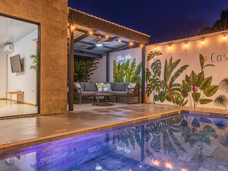 From the bed, you can enjoy the view of the pool. Have access, to a private covered terrace that overlooks the beautiful gardens and pool area. The surroundings are illuminated with lights creating an atmosphere surrounded by nature. It's a spot to relax, witness sunsets, and gaze at the starry night sky.