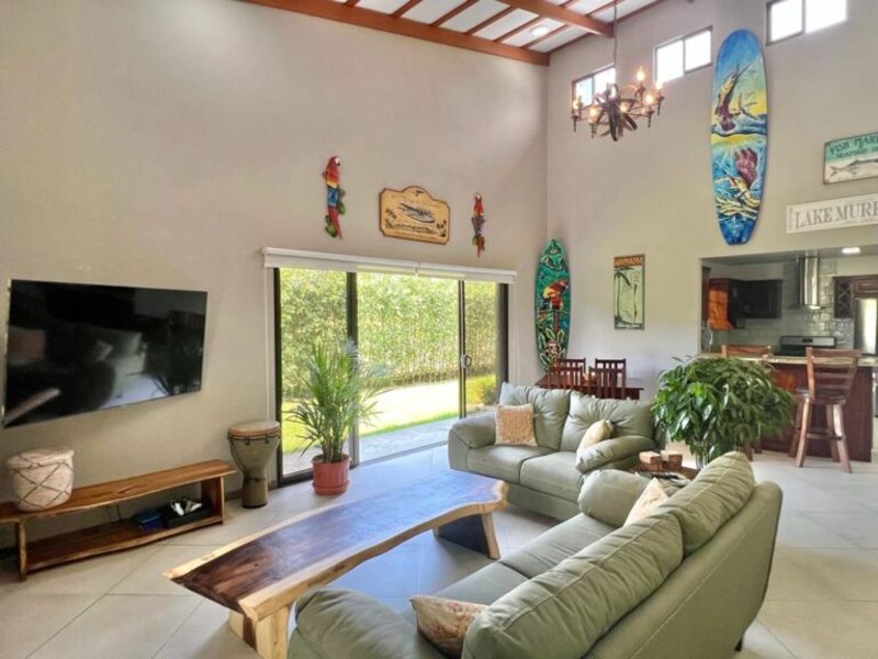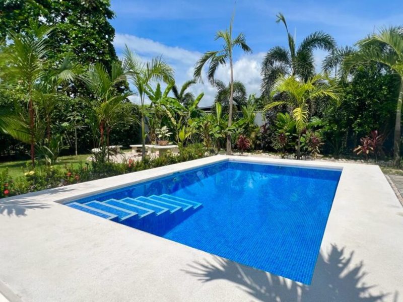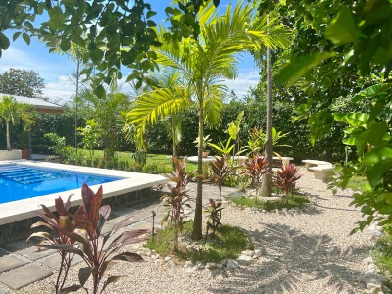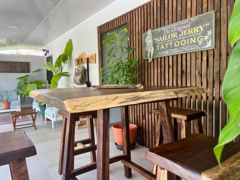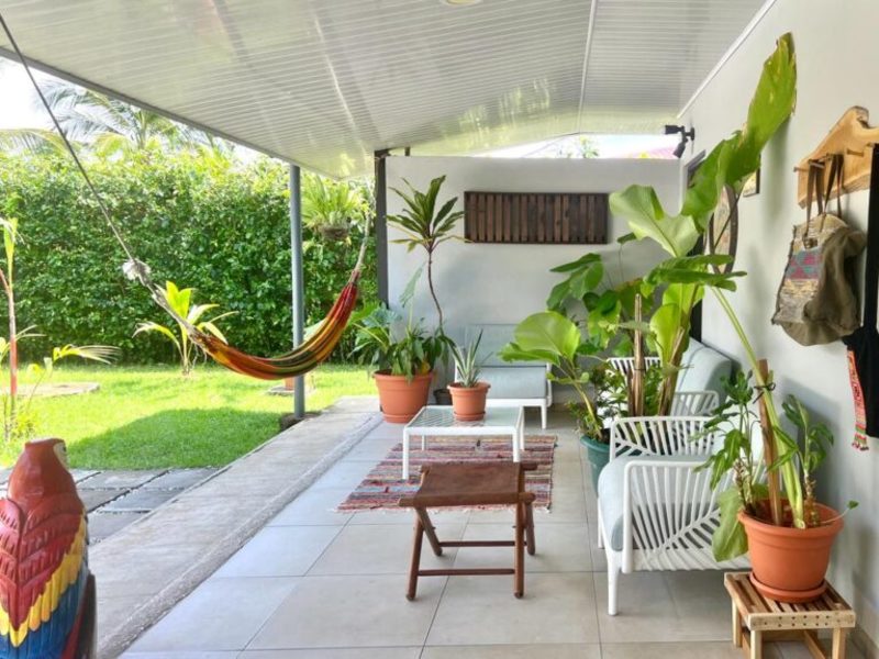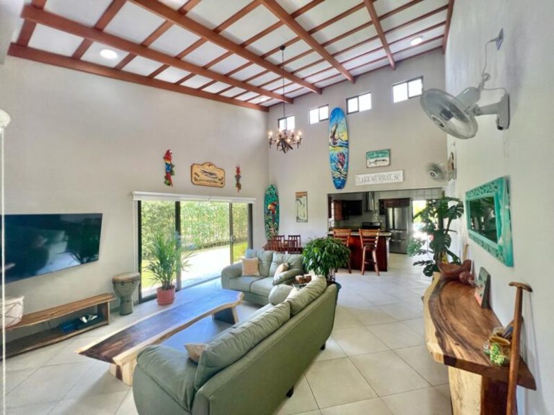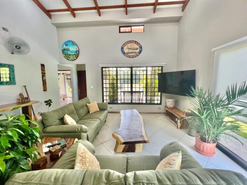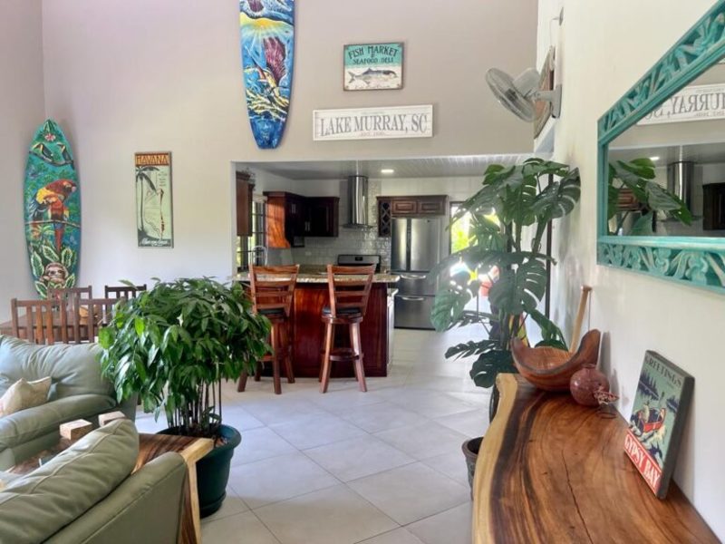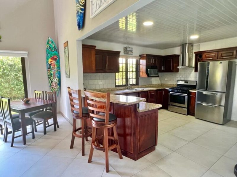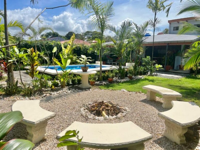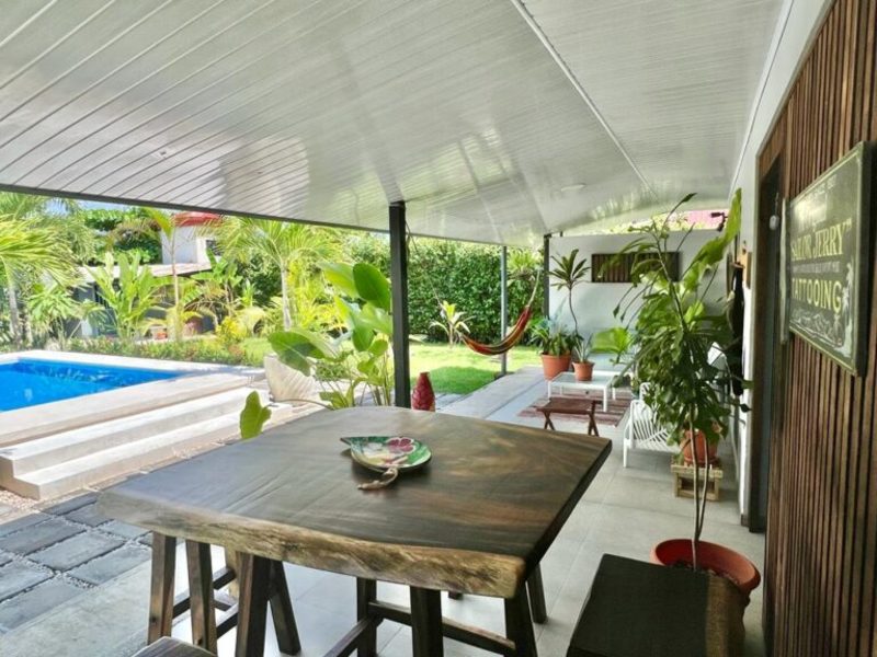 Transitioning through the kitchen leads you to the outdoor living area, providing delightful views of the pool and beautifully landscaped gardens. Here, a custom Guanacaste table and chairs await outdoor dining, complemented by an outdoor patio set and a hammock for moments of relaxation. After a fun-filled day, unwind by the outdoor campfire pit and sitting area. The fully landscaped and enclosed property is perfect for families with pets.