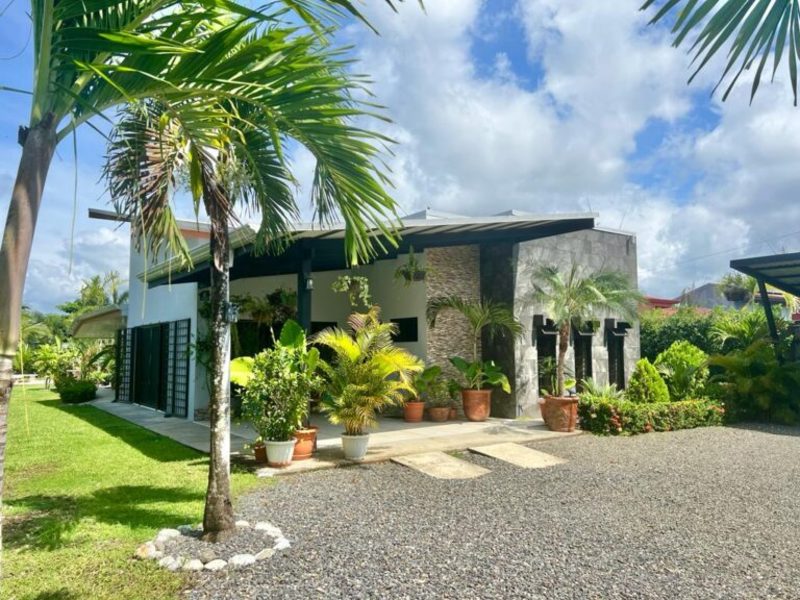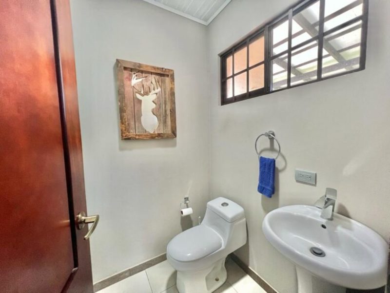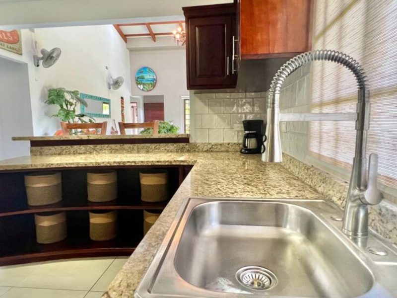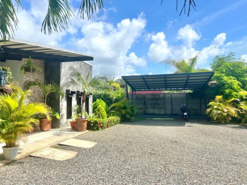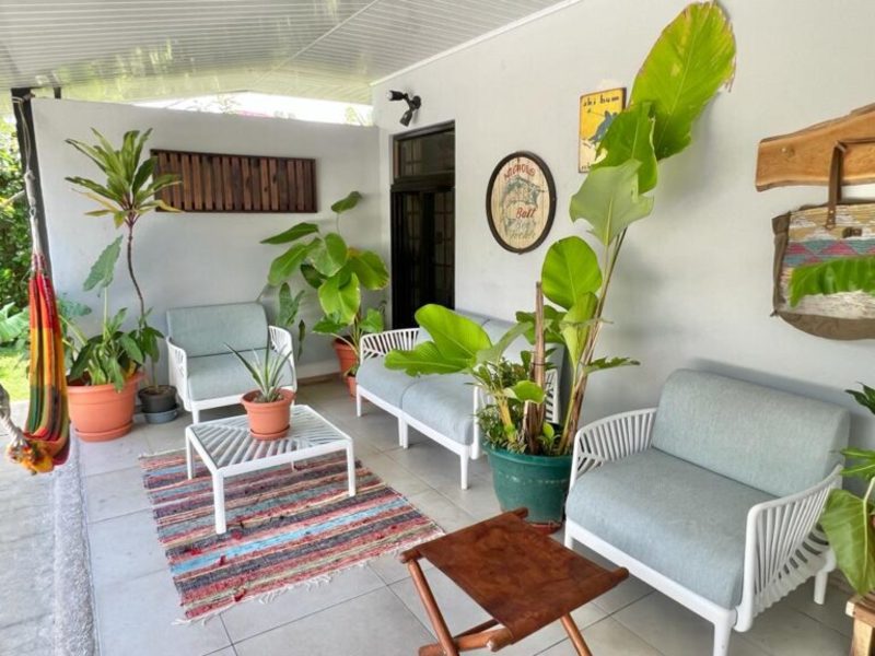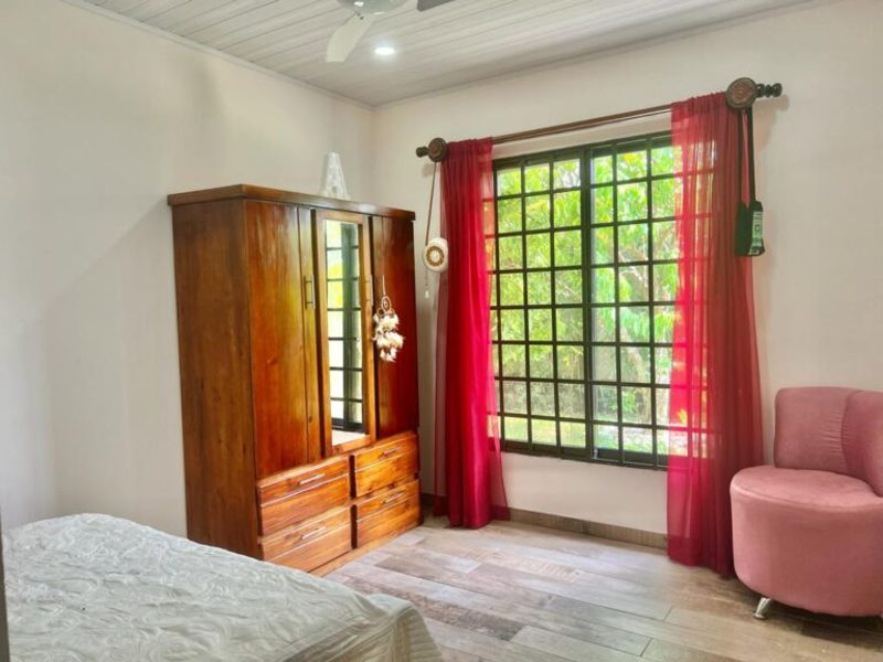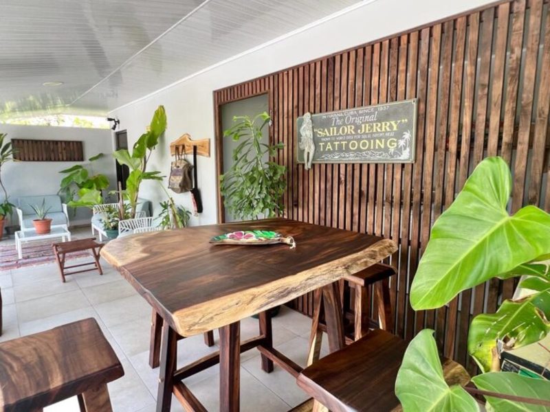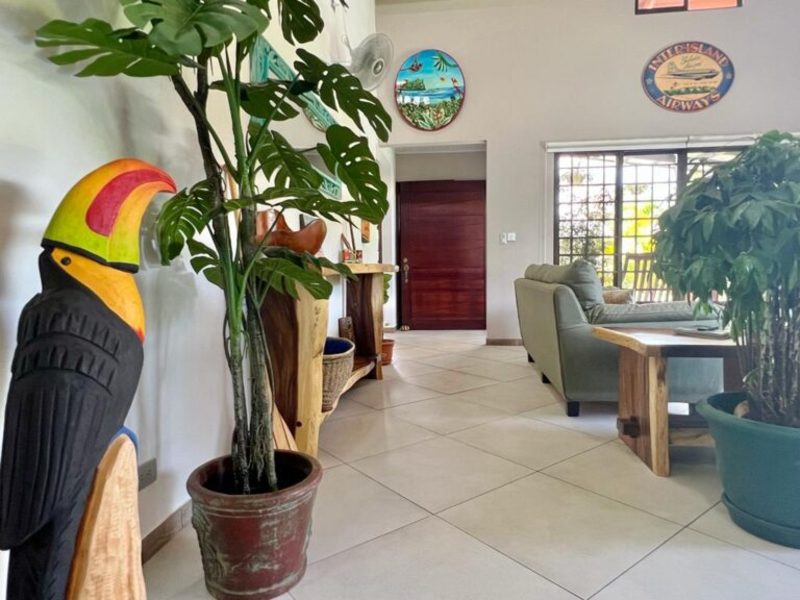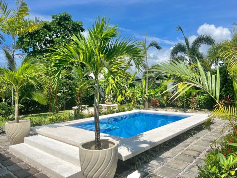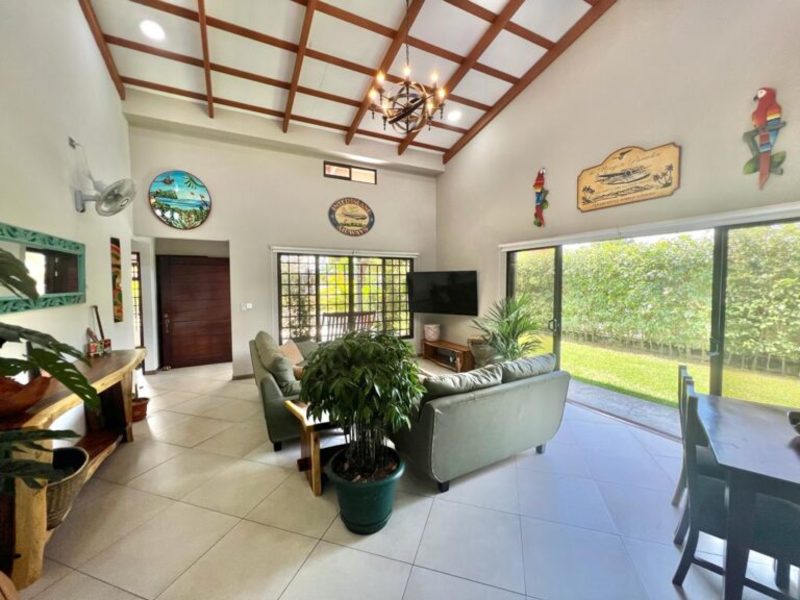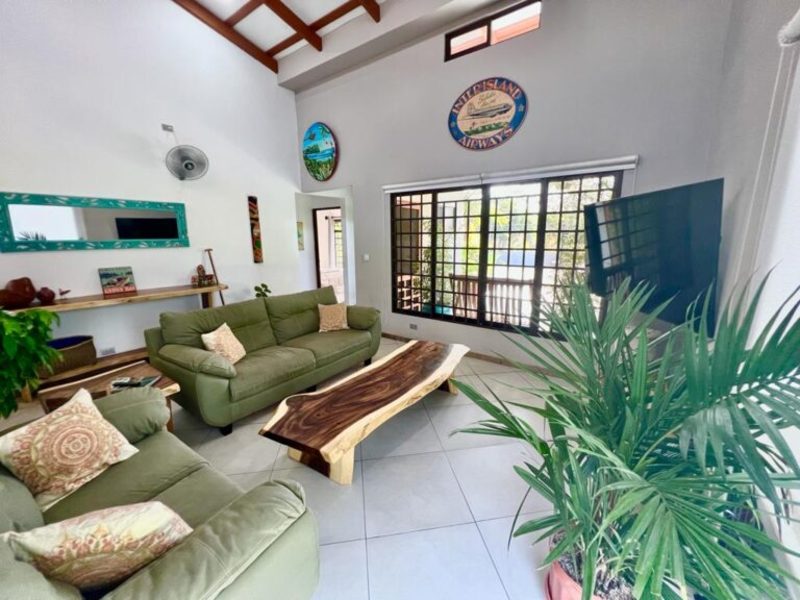 Transitioning through the kitchen leads you to the outdoor living area, providing delightful views of the pool and beautifully landscaped gardens. Here, a custom Guanacaste table and chairs await outdoor dining, complemented by an outdoor patio set and a hammock for moments of relaxation. After a fun-filled day, unwind by the outdoor campfire pit and sitting area. The fully landscaped and enclosed property is perfect for families with pets.