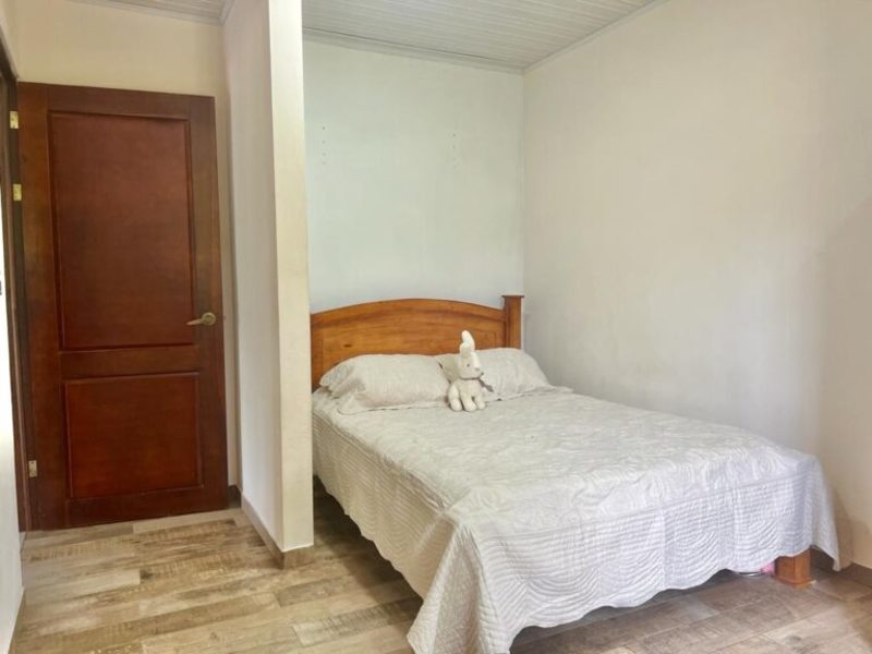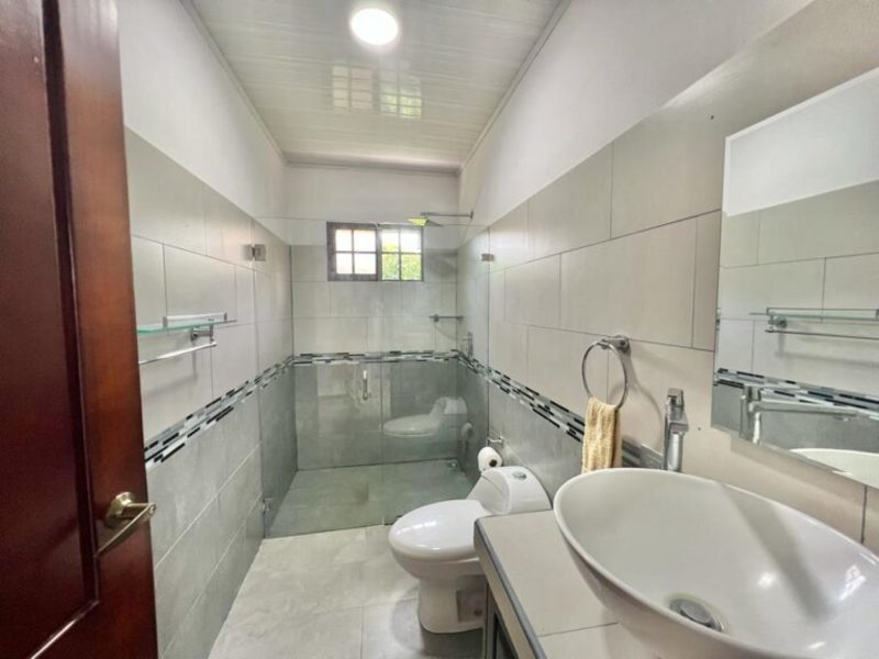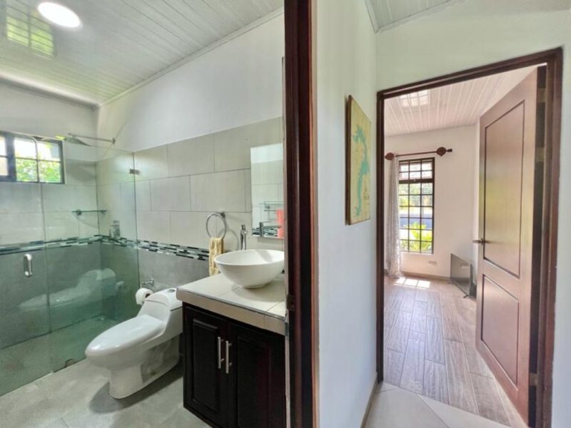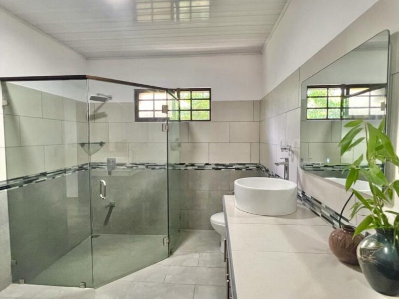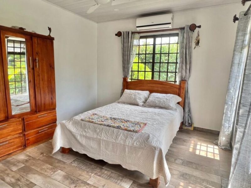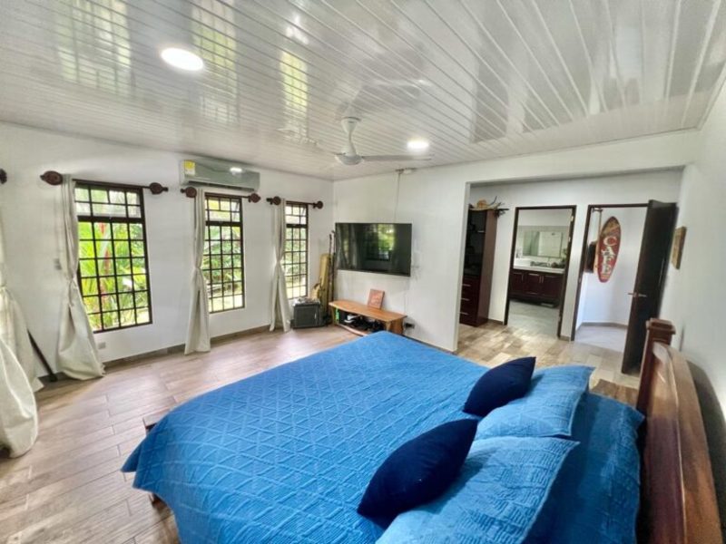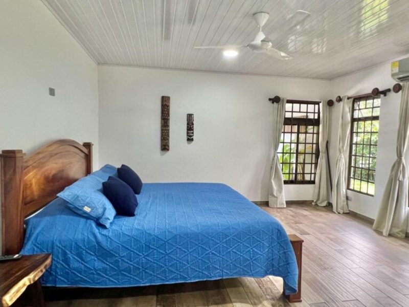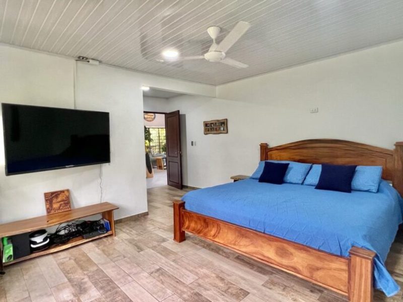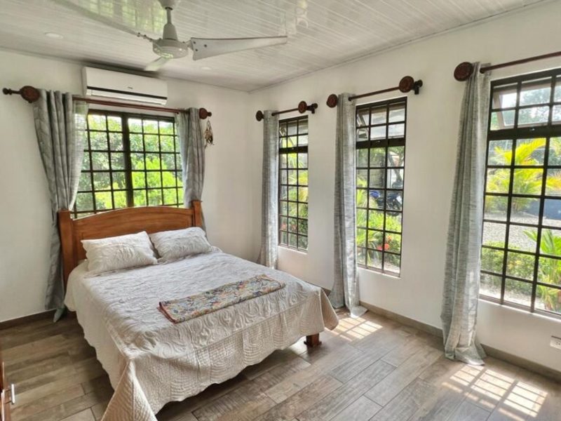 The master bedroom, situated at the opposite end of the house, offers a king-size bed, a large flat-screen TV, numerous windows for natural light, a walk-in closet, and an ensuite bathroom. Separated from the master suite, the other two guest bedrooms feature double-size beds (with space for queens) and share a bathroom.