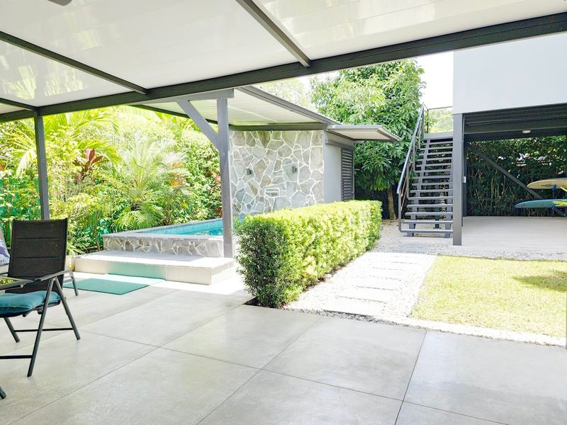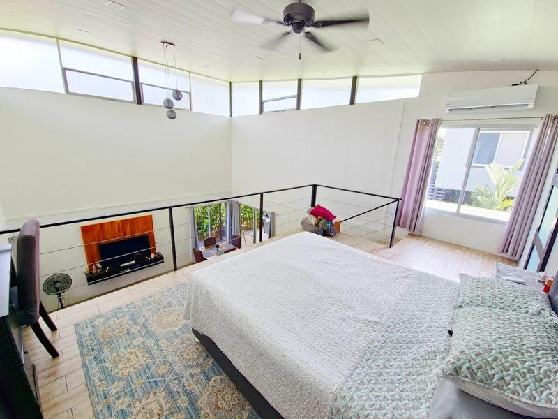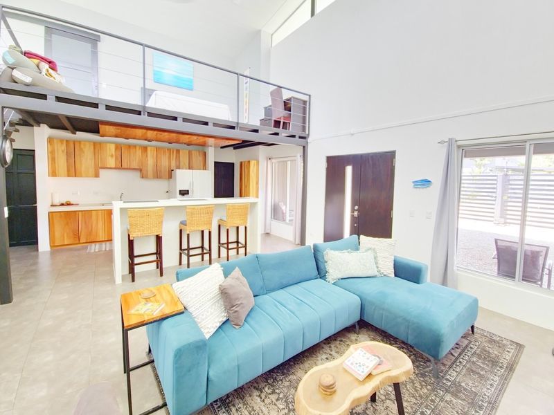 Upon entering you'll be greeted by a living room with aluminum sliding doors that seamlessly connect to the covered terrace, pool, and garden. A stylish metal staircase leads up to the Mezzanine Master Bedroom and bathroom—a centerpiece of this dwelling.