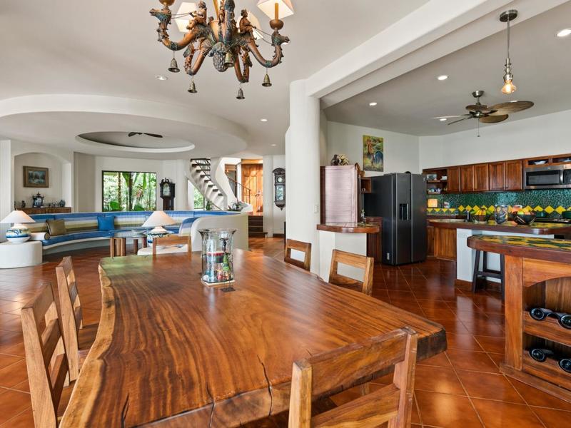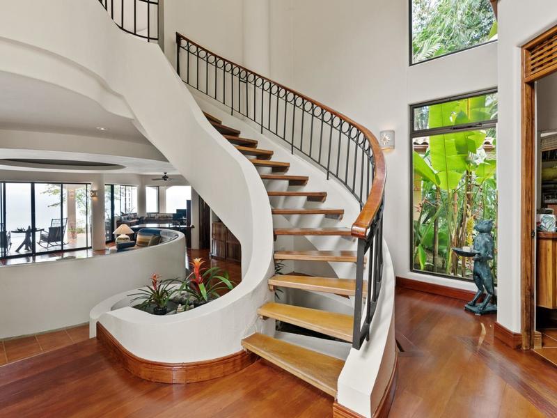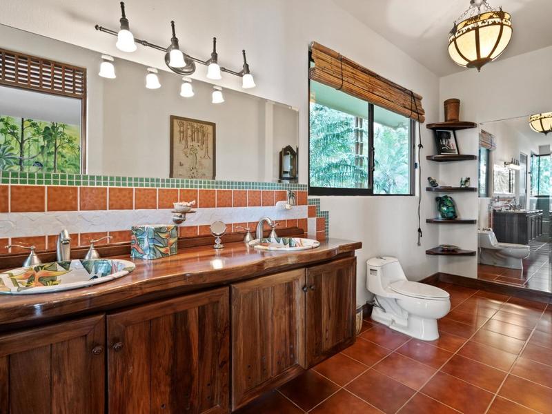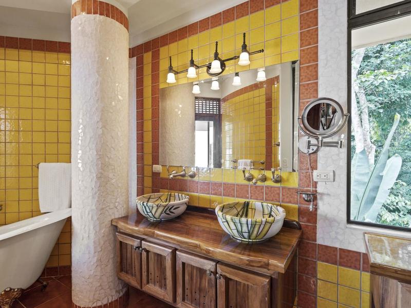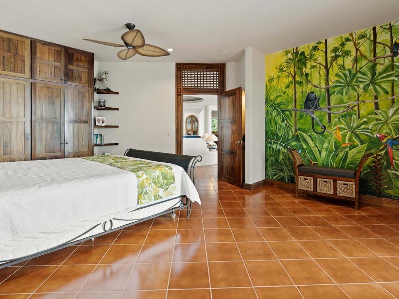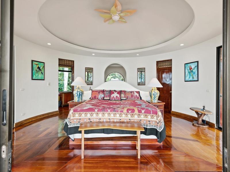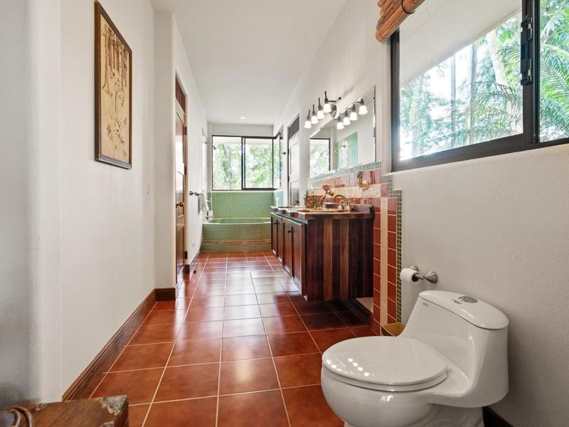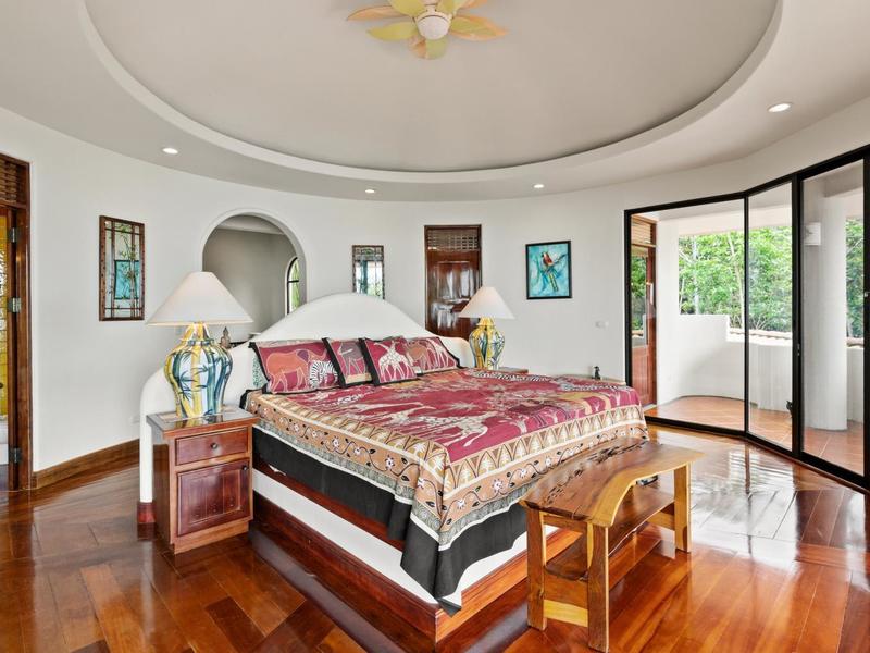 Upon entering through the grand two-story foyer with a domed fresco ceiling and a circular staircase adorned with iron railings and rare hardwood floors, you are welcomed into a residence of unparalleled elegance. The master suite, occupying the entire second floor, boasts a wrap-around balcony offering sweeping ocean views at eye level with passing monkeys and the melodic tunes of Toucans in the trees. The spacious ensuite bathroom features intricate mosaics, a double vanity with a clawfoot tub, and an outdoor shower, complemented by a luminous walk-in closet with teak cabinets and shelving.