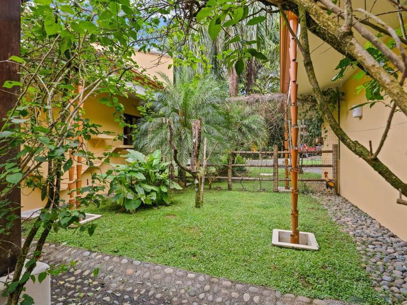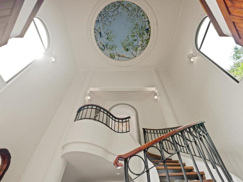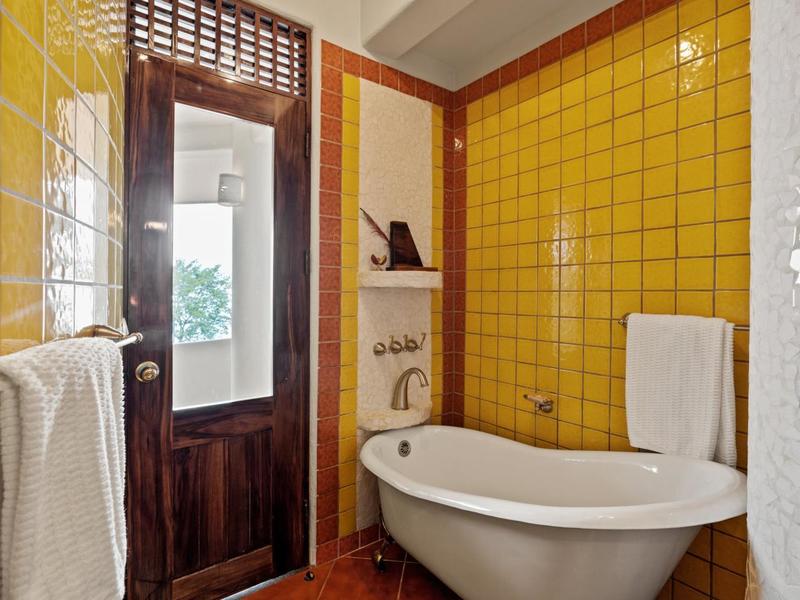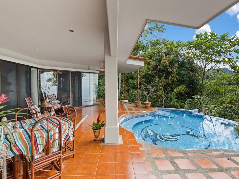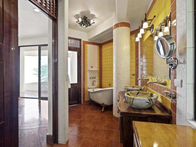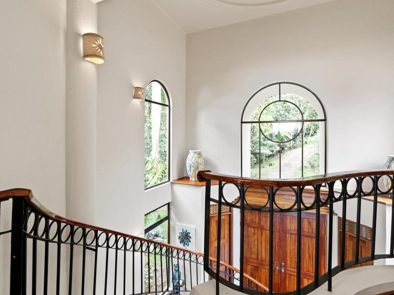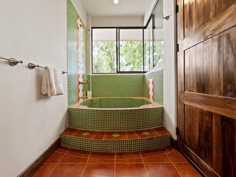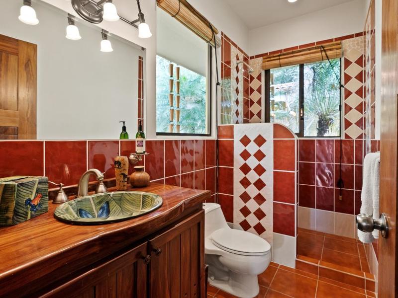 Upon entering through the grand two-story foyer with a domed fresco ceiling and a circular staircase adorned with iron railings and rare hardwood floors, you are welcomed into a residence of unparalleled elegance. The master suite, occupying the entire second floor, boasts a wrap-around balcony offering sweeping ocean views at eye level with passing monkeys and the melodic tunes of Toucans in the trees. The spacious ensuite bathroom features intricate mosaics, a double vanity with a clawfoot tub, and an outdoor shower, complemented by a luminous walk-in closet with teak cabinets and shelving.
