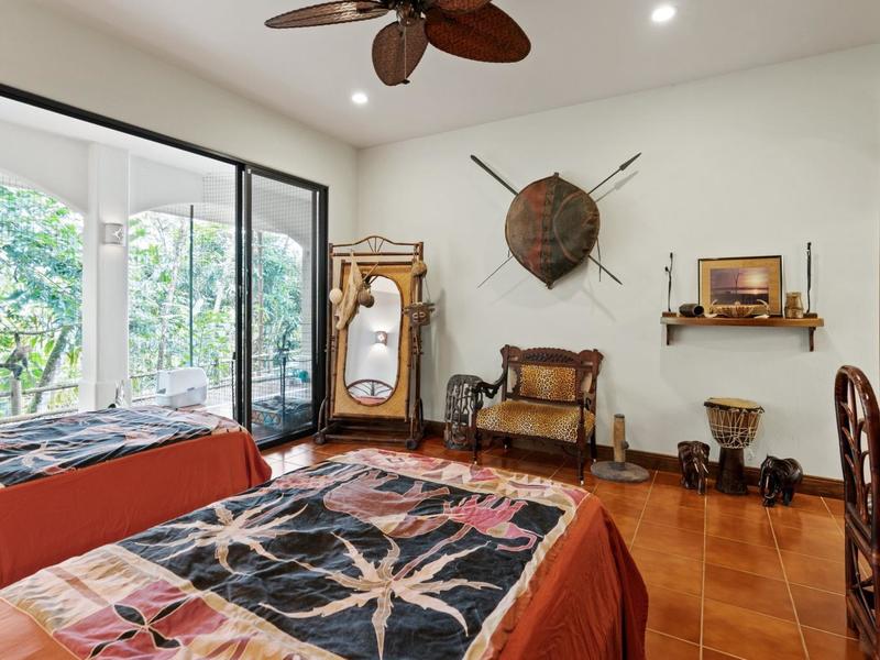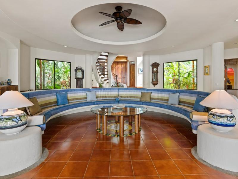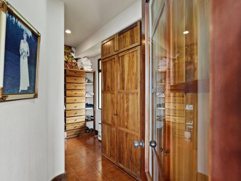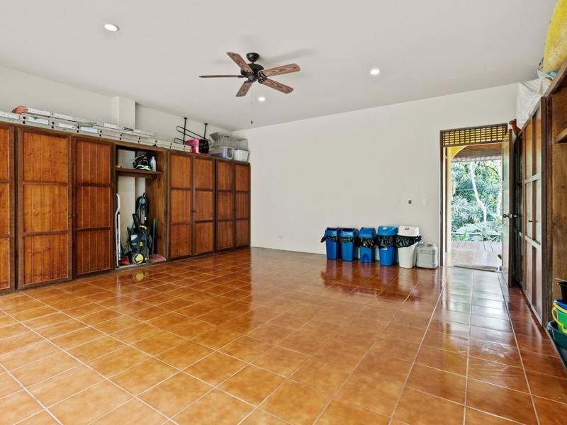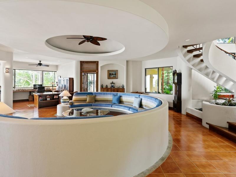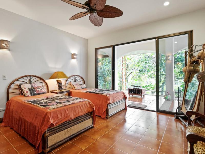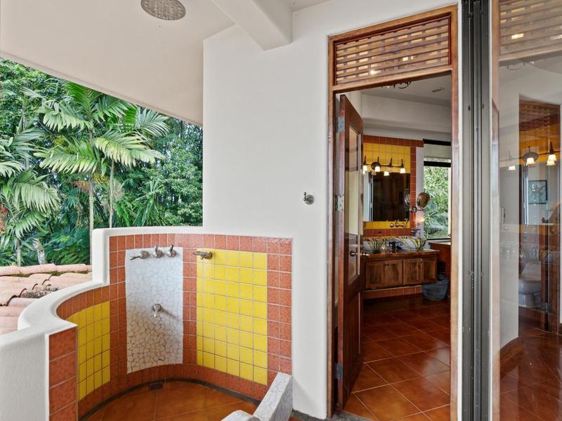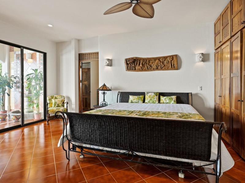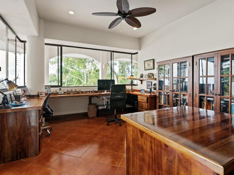 Flanking either side of the home are large guest suites, each equipped with teak closet cabinetry and private walk-outs to covered patios with mesmerizing views of the jungle and ocean. A spacious garden courtyard with a covered walkway separates the home from the two-car garage and a sizable laundry and services room.