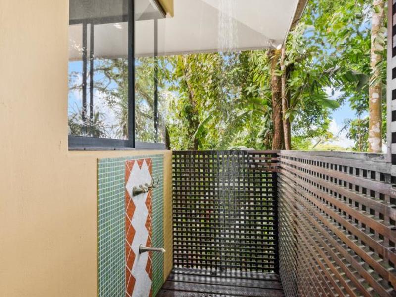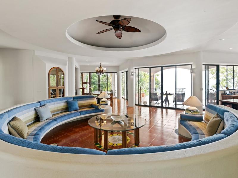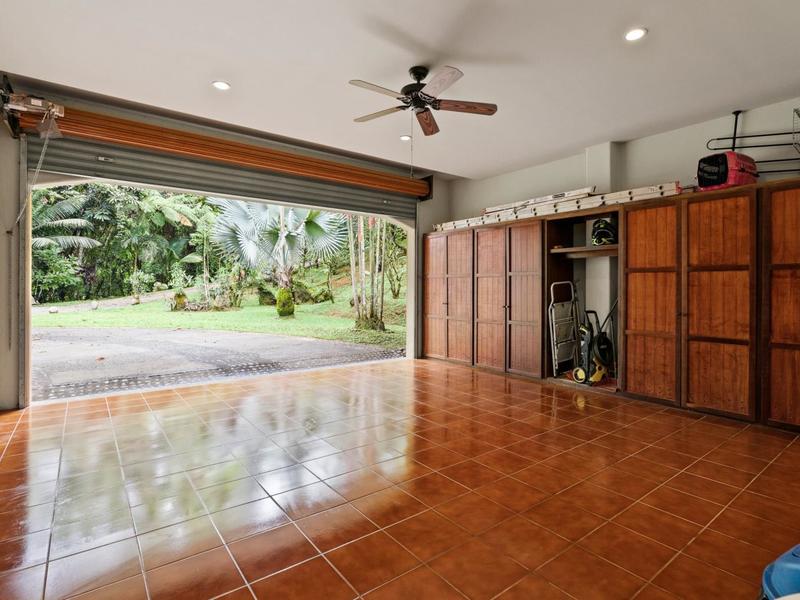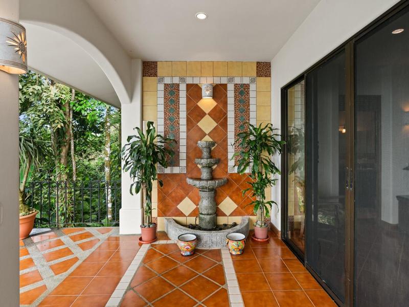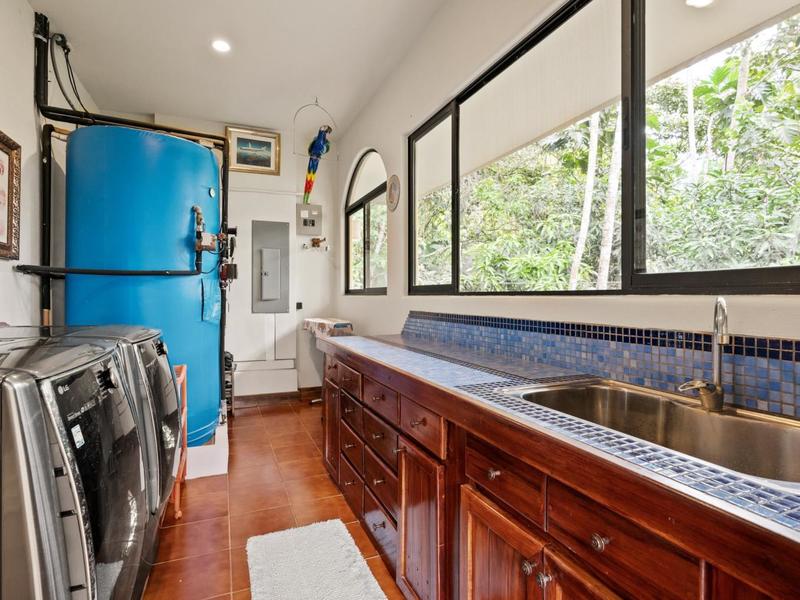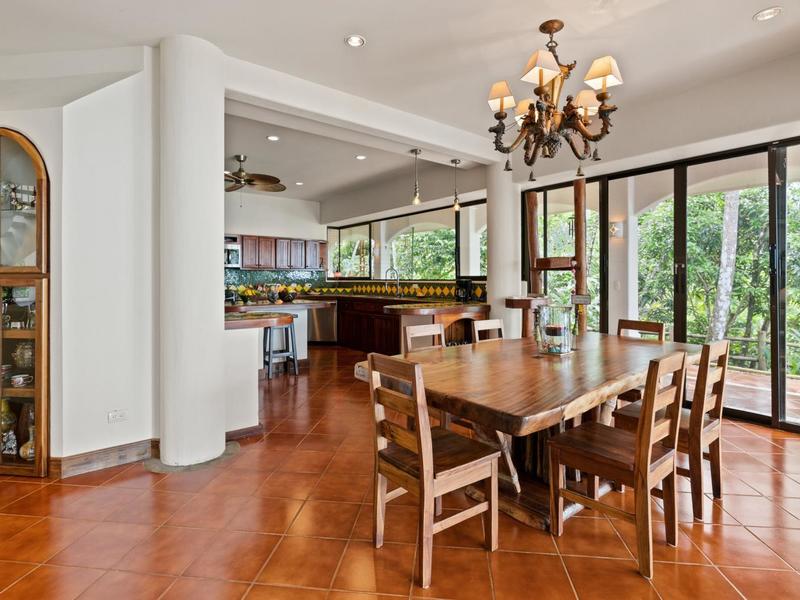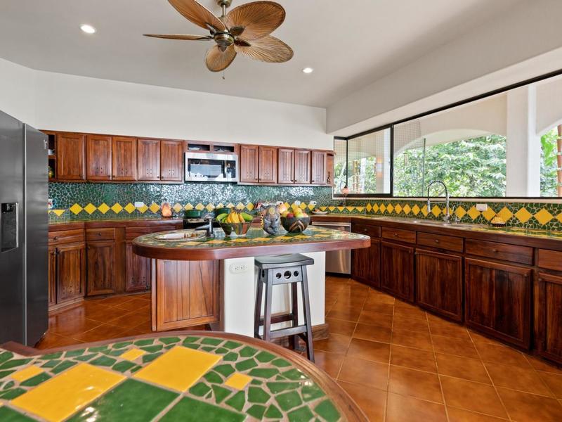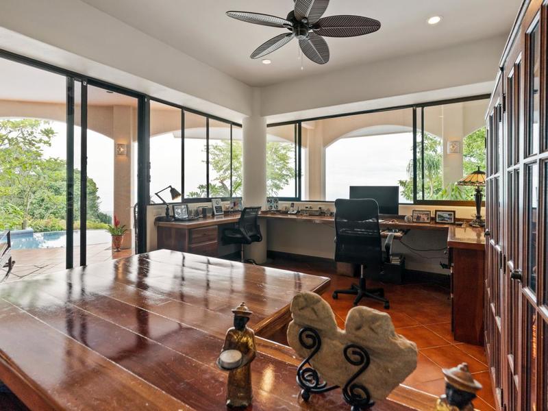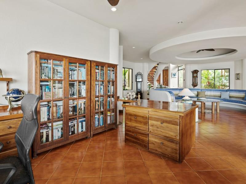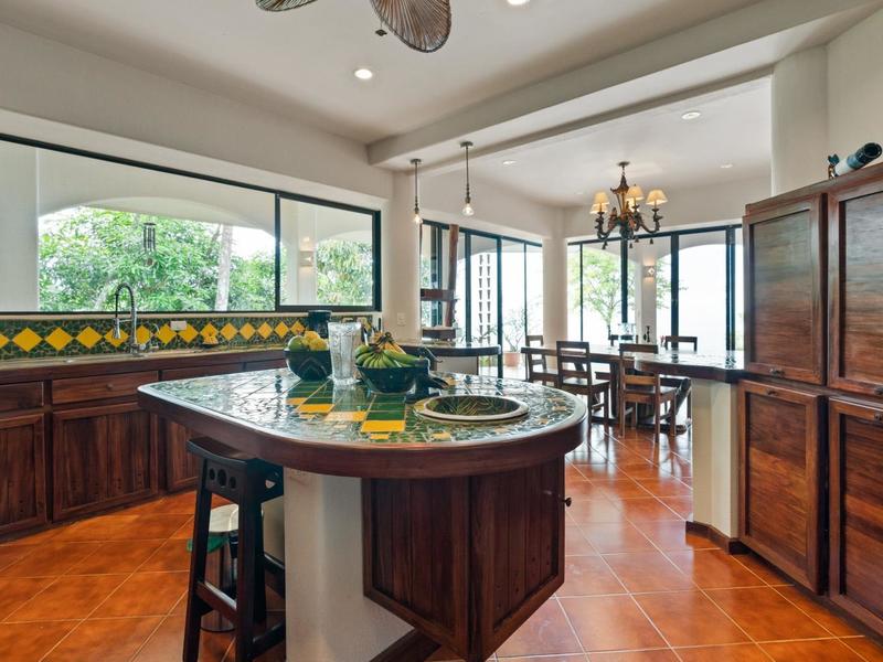 Flanking either side of the home are large guest suites, each equipped with teak closet cabinetry and private walk-outs to covered patios with mesmerizing views of the jungle and ocean. A spacious garden courtyard with a covered walkway separates the home from the two-car garage and a sizable laundry and services room.