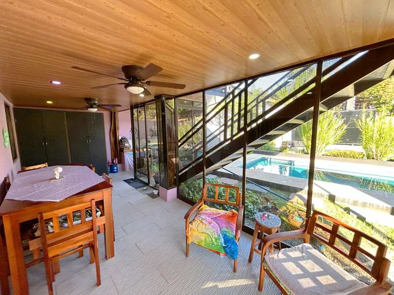 The main floor encompasses the kitchen, dining, and sitting area, enclosed with floor-to-ceiling windows that flood the space with natural light. An indoor office and living room (or potential third bedroom) provide spacious, air-conditioned comfort. The main bathroom features a full shower and a closet for storage. Ascend to the second floor, where an additional open-air lounge area connects to two bedrooms, each equipped with air conditioning and a half bathroom. This versatile second floor could easily accommodate the addition of a kitchenette for guest use or serve as a game room.