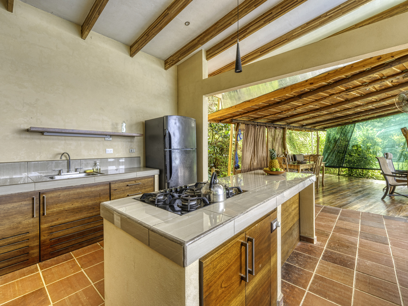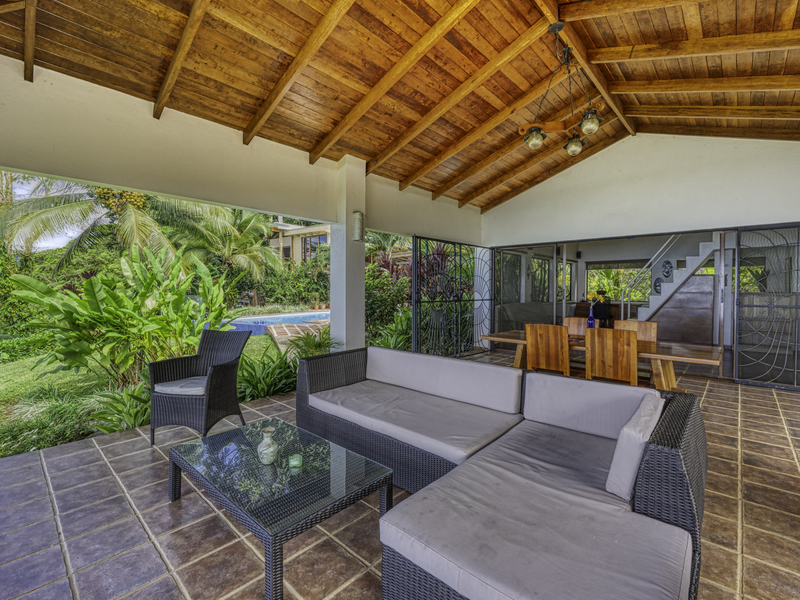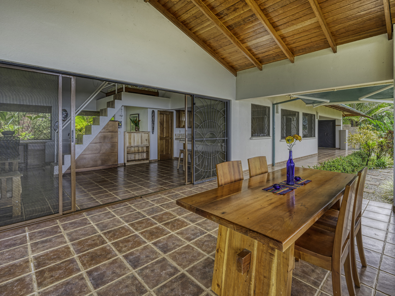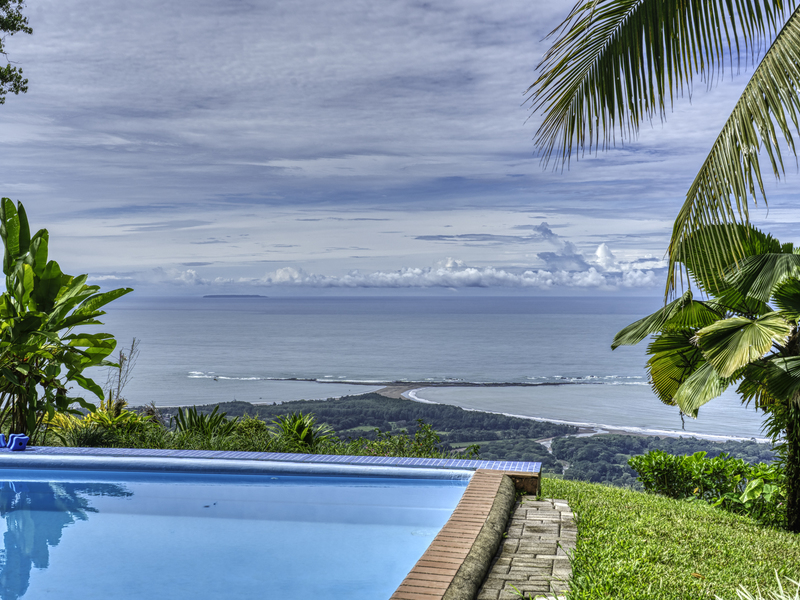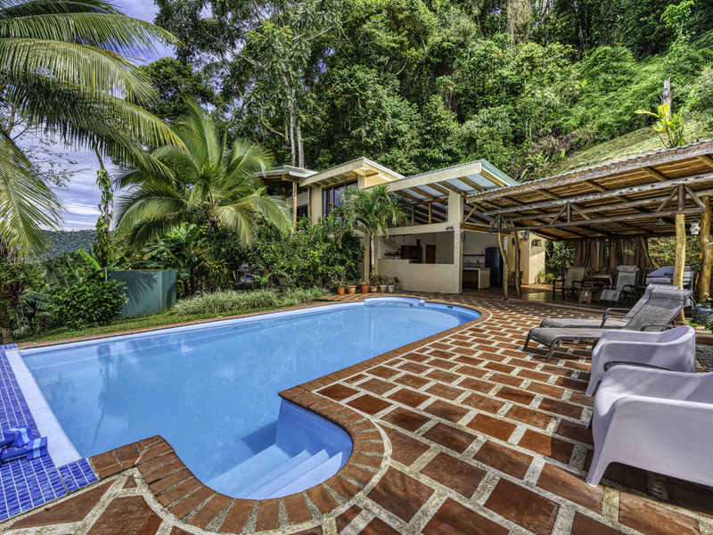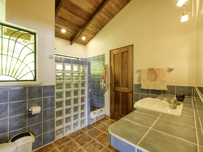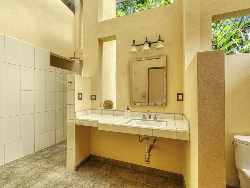 The large pool area offers captivating views of the ocean and surrounding mountains. Complementing the pool area is an outdoor shower, a large indoor shower and change room, a bathroom, and a large laundry area. Due to the steep mountains near the ocean, you can see the fin-shaped sandbar of Uvita's famous Whale Tail reef from the balconies of each room and different spots along the mountainside of this property.