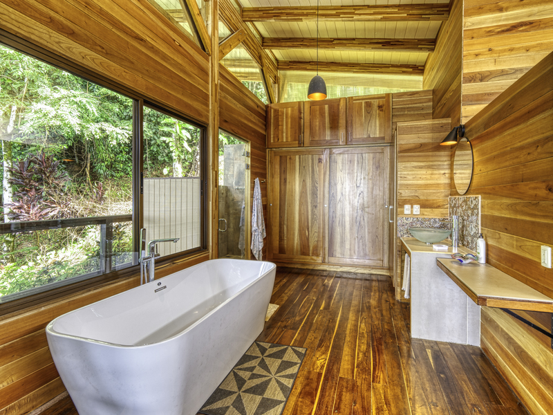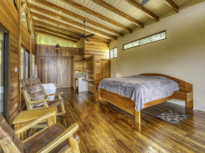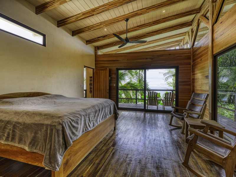 Step into an expansive primary suite with two bathrooms and a scenic ocean-view seating area, featuring hardwood flooring and panoramic vistas of the lush jungle. The private balcony of the primary bedroom seamlessly blends indoor and outdoor living, offering breathtaking views of the natural beauty that defines this exceptional property.