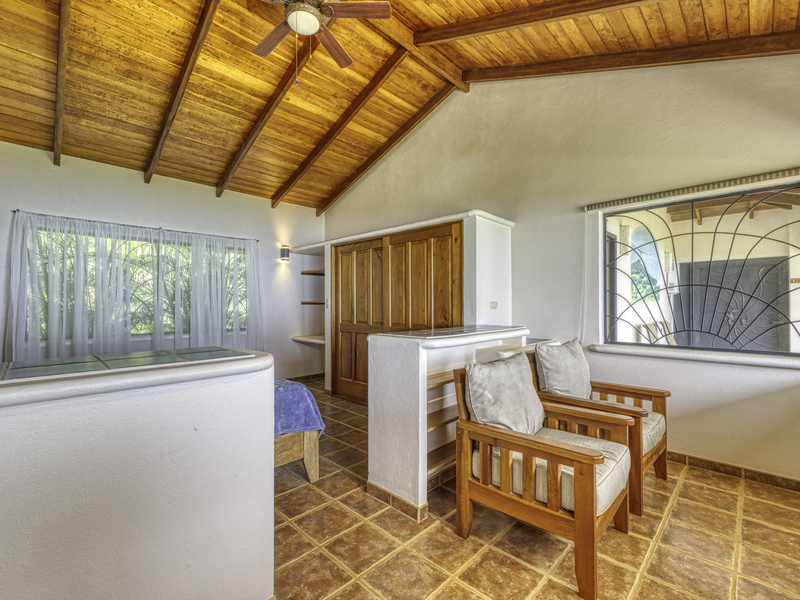 The property includes an attractive guest house built in 2003 with a solid concrete block structure and open-air screened windows, maximizing airflow. It features high hardwood ceilings throughout the entire home and terrace area, with a kitchen, living room, large bedroom with oceanview seating area, full bath, loft area with a second bed set up, and a cozy sleeping nook under the stairs. A spacious outdoor covered terrace with roll-down awnings adds allure alongside an additional uncovered deck. An attached garage, tiled and with a vaulted ceiling, has roughed-in plumbing ready for conversion to a bedroom suite if desired. A large covered carport completes this area of the property.