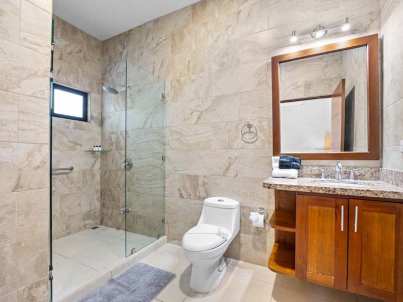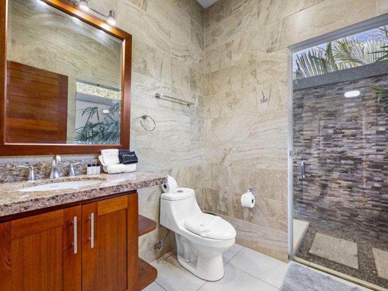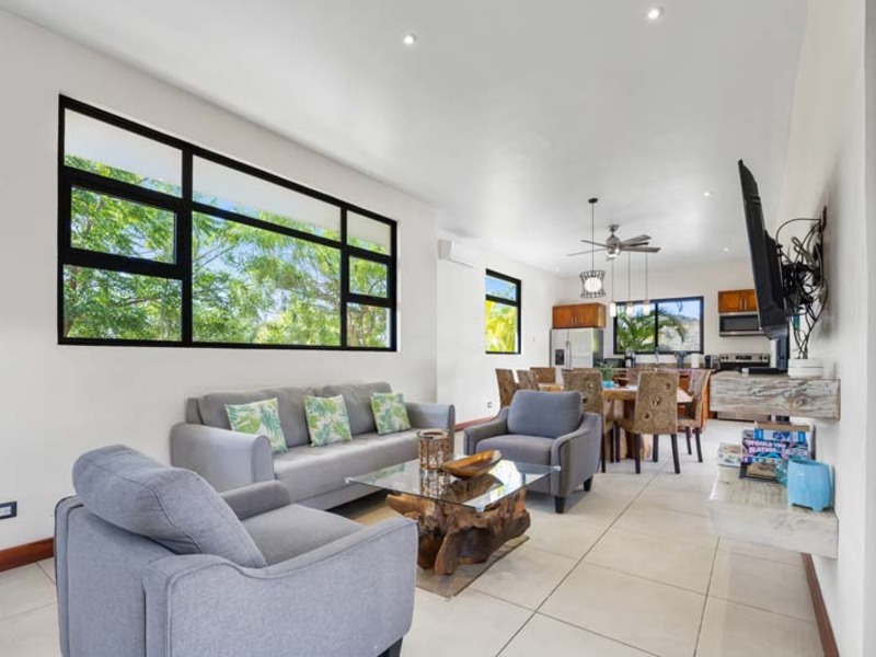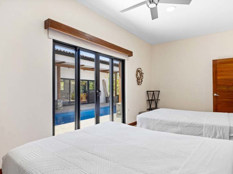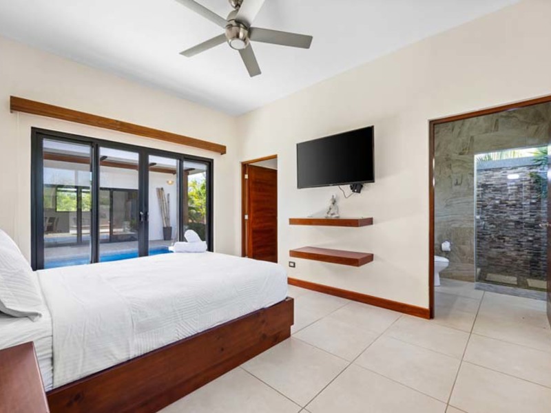 The living area is a sanctuary of comfort, featuring plush furnishings and a flat-screen cable television. Step outside to the covered terrace and rancho, where views of the surrounding nature provide an idyllic backdrop for al fresco dining and gatherings. Two bedrooms offer direct access to the pool area, inviting guests to take a refreshing dip at their leisure. The master bedroom features a unique tropical outdoor shower for a luxurious spa-like experience amidst the natural surroundings.