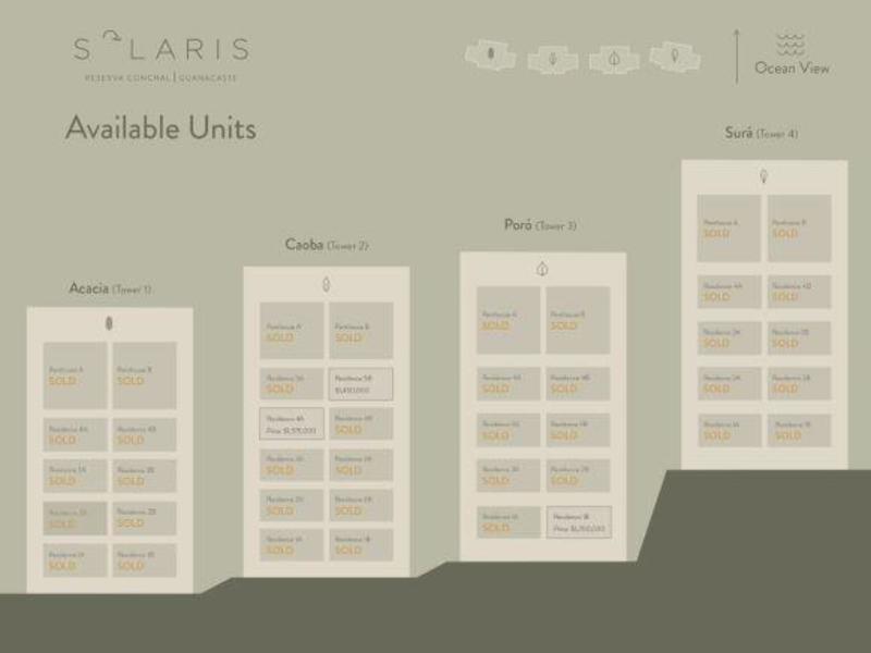 Welcome to Solaris, a brand-new luxury condo community in the most sought-after exclusive Reserva Conchal. With breathtaking ocean views, these 42 high-end residences offer a modern comfortable home, with open spaces, tasteful furniture, and a chef's kitchen. The master plan is distributed across 4 residential towers: Acacia, Caoba, Poró, and Surá which are 5 or 6 stories each.