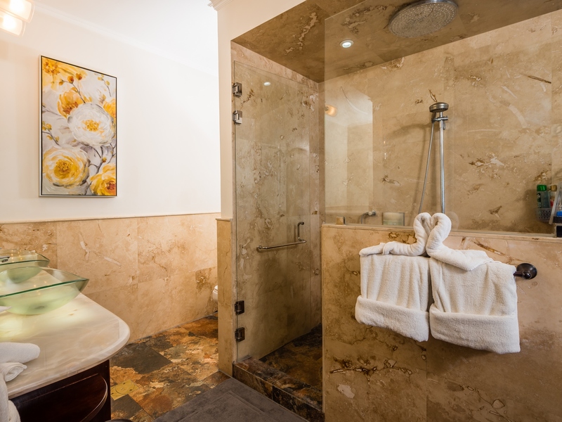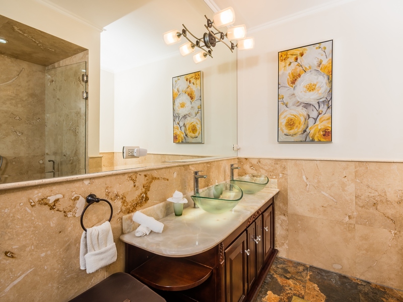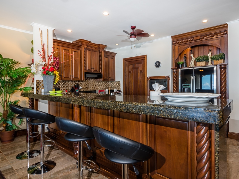 If you seek an ocean vista, in a sophisticated setting with the convenience of condo life then look no further than the exquisite Flamingo Towers Penthouse #32. This spacious 3132 sq ft abode boasts a layout that's ideal for both living and hosting guests. The flow from the leather sofas in the living area to the dining space and onto the designed kitchen featuring granite countertops, bespoke wooden cabinets, and a wine cooler is seamless.