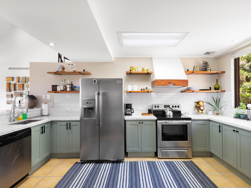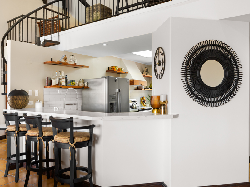 Inside, the bright kitchen has been tastefully remodeled with solid wood cabinets painted in a soothing moss hue, open shelving, stainless steel appliances (including a brand new stove and exhaust fan), and quartz countertops, complemented by a charming eating bar. Additionally, the penthouse features ample storage and a convenient laundry room.