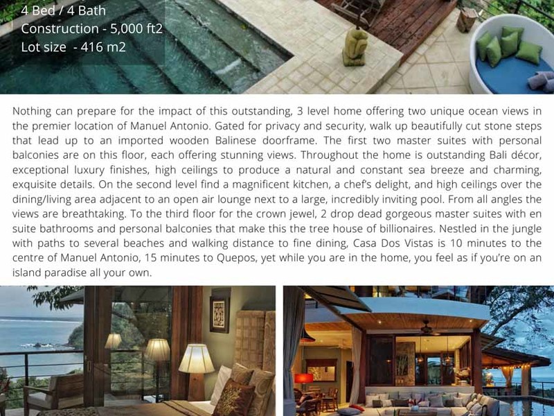 Nothing can prepare you for the impact of this outstanding, 3 levels home offering two unique ocean views in the premier location of Manuel Antonio. Built with imagination and impeccable architectural details, Casa Dos Vistas is the newest luxury home in the area.