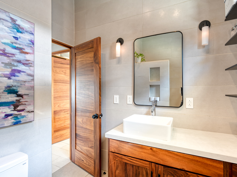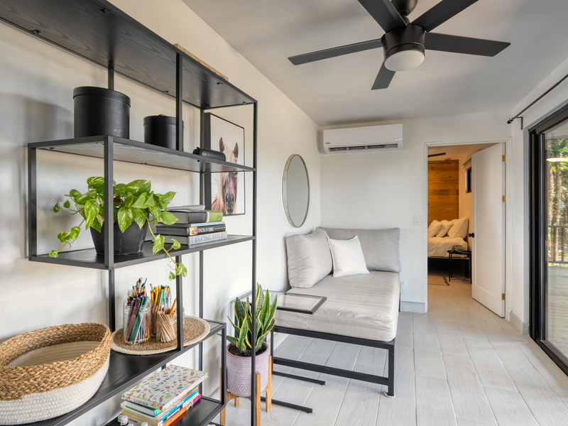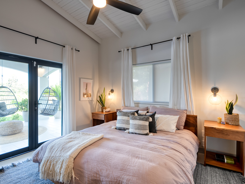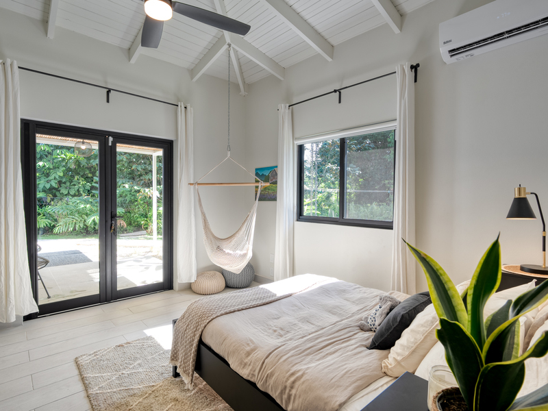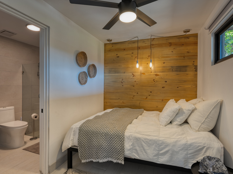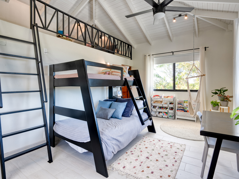 There are 2 additional bedrooms in the main home each with its own closet, one with a hanging swing and a private patio entrance. The other bedroom is a large bedroom with an additional loft, the perfect space for storage or for kids to read; it also offers beautiful mountain and property views and of course a private bathroom with plenty of storage.