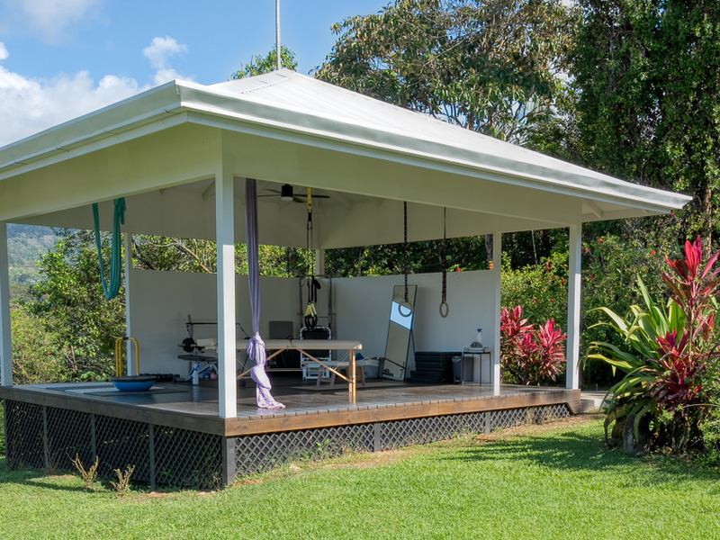 The covered yoga and workout facility is surrounded by nature and would make a perfect addition for any fitness enthusiast!