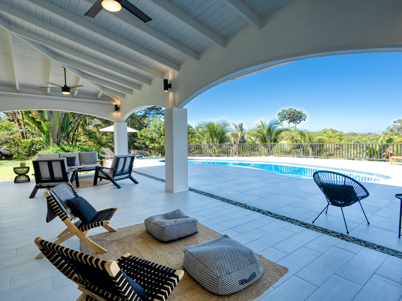 The outdoor entertaining area lets you enjoy the sunset views. There is a full-size wooden dining table and BBQ station right outside the kitchen on the patio, with an outdoor sofa and seating nearby. An array of other chairs and swings sit on each patio, creating a comfortable and relaxing resort like feel. By the pool deck, there is a sparkling blue pool with lounge chairs and umbrellas, perfect for relaxing. The pool pump is also brand new.