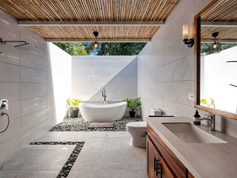 There are four bedrooms and 4.5 bathrooms in total. The master suite is comfortable and conveniently situated on the main floor with a private patio entrance and pool views. The master bath includes a spa-like outdoor soaking tub and the private walkthrough closet offers plenty of storage space.