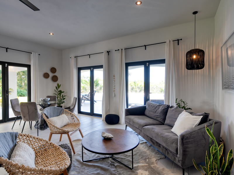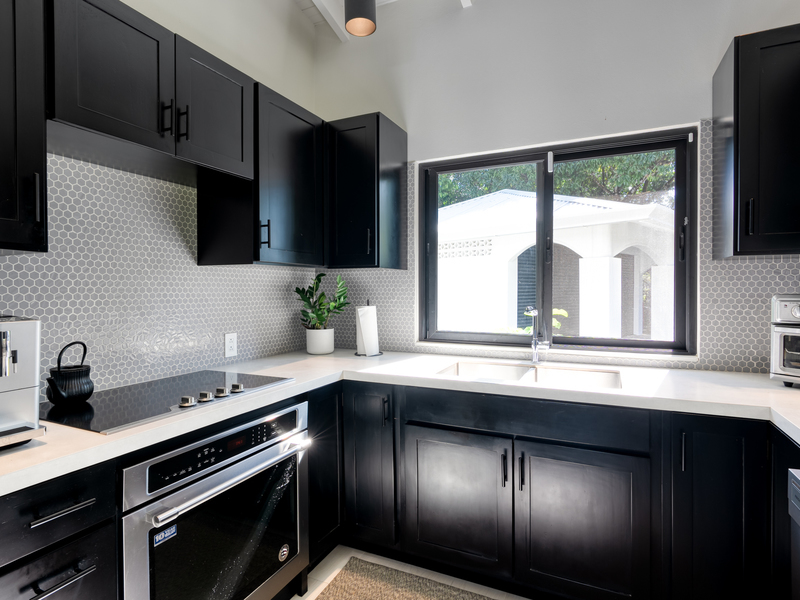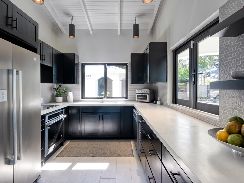 The gourmet kitchen features quality countertops, custom black cabinetry, and stainless-steel appliances. The floor plan helps with entertaining guests or keeping an eye on the family. Dine in elegance at the modern glass table with comfortable chairs next to a contemporary living area. Natural light floods the room through multiple patio doors which provides easy indoor and outdoor dining access.