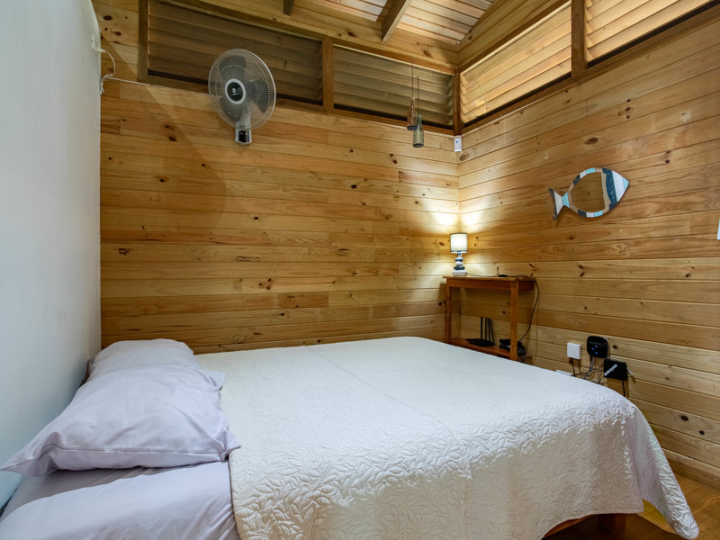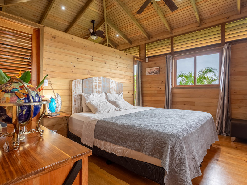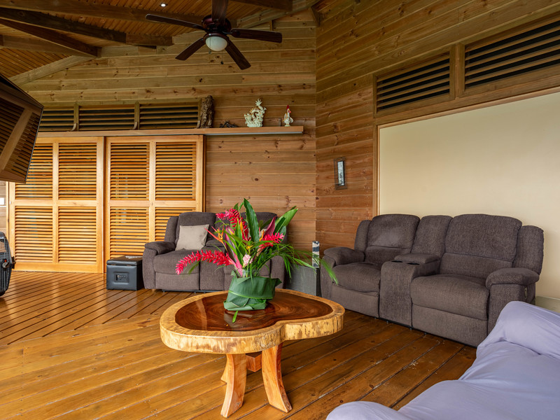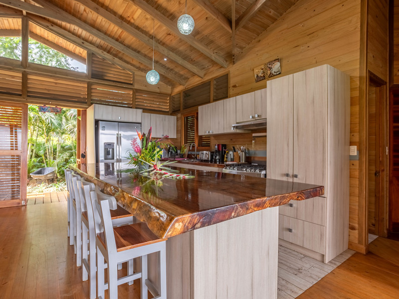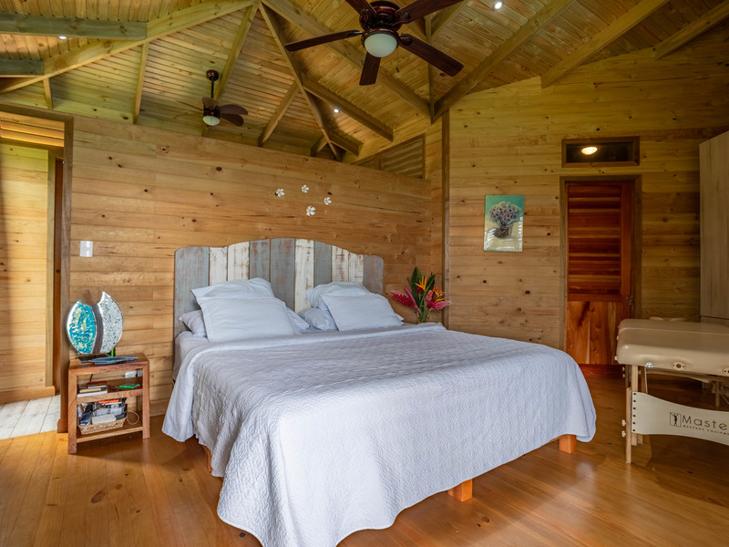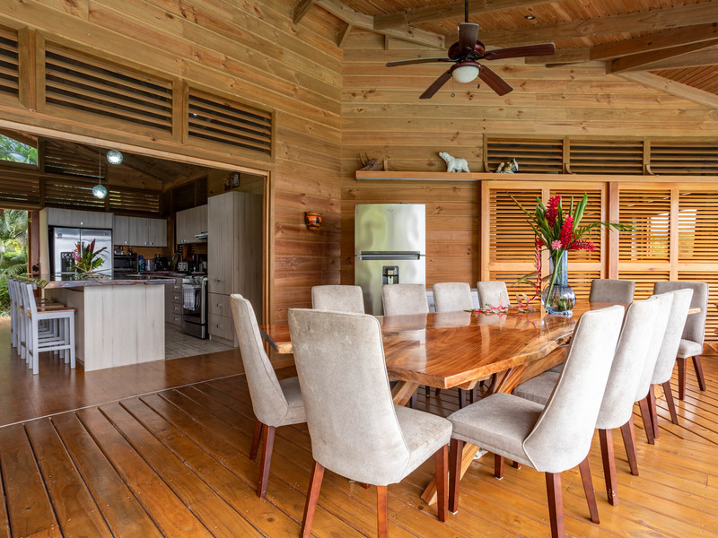 The rustic single-story house, constructed in 2018, provides breathtaking panoramic views of the sea, jungle, and mountains. These views encompass Cano Island, a renowned biological reserve, as well as Garza Island, a river-delta island featuring serene and unspoiled coconut-grove-lined beaches.