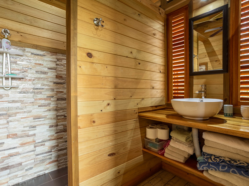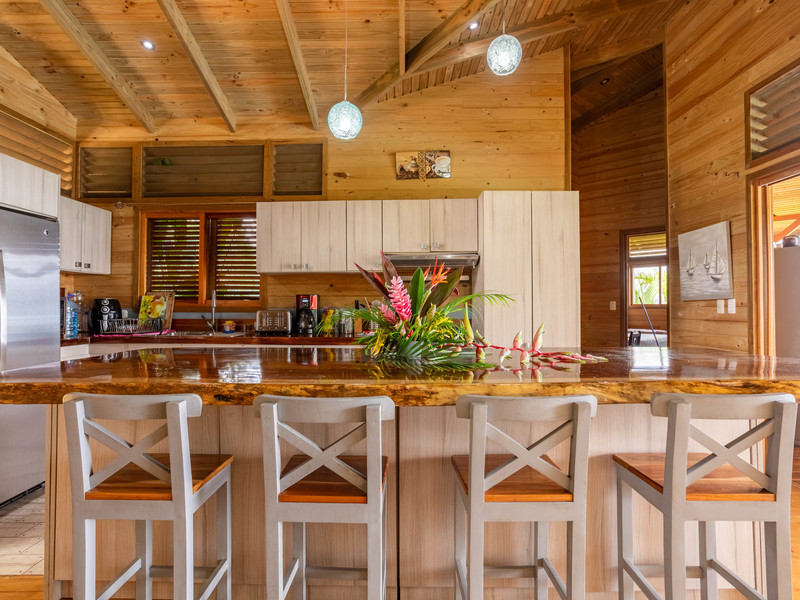 The house is adorned with exquisite warm lumber. From the floors, walls, cabinets, window frames, and furniture, to the ceiling, every element radiates beautiful, natural, and soothing tones that harmonize with the surrounding nature. The layout, open construction, and natural finish seamlessly blend the boundaries between outdoor and indoor spaces, making the most of our breathtaking location and climate.