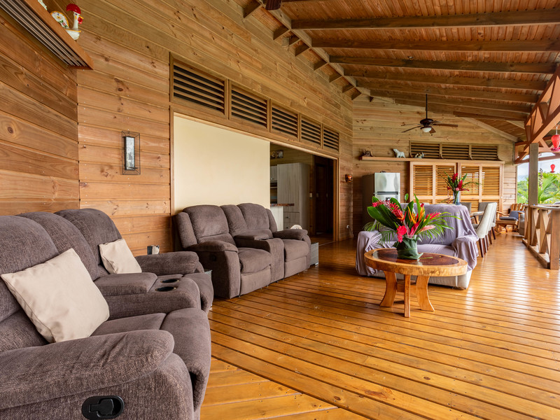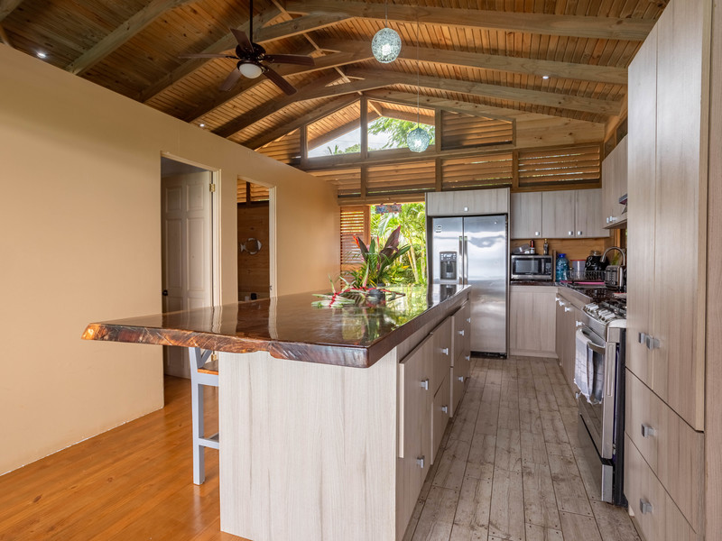 The house boasts a stunning open-air dining room and living room, benefiting from the constant sea and mountain breezes and offering breathtaking views of the ocean. The kitchen provides a delightful space to savor this view while preparing meals, and enjoying the refreshing breeze. The infinity pool, nestled in a lush tropical garden, beckons you and your guests for a rejuvenating swim. With 3 bedrooms, office space, 3 bathrooms, and a laundry room, the house ensures your comfort and convenience. The attached 2-car carport provides shelter, and a newly built additional laundry room, storage room, and parking area for an extra car are conveniently located nearby.